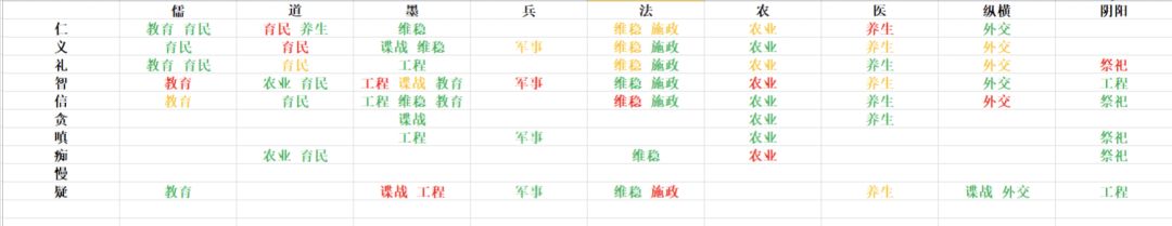 个人整理了一下游戏内人才的心性对于某些面板的影响。 颜色标识为该流派且对应心性时在100智略时能达到的面板高度。 红色为200 橙色为190-200 绿色为180-190 比如图片里墨家人才心性为智时,培养到100智略时他的工程能力是200,谍战能力为190-200之间,教育能力为180-190之间(整理时可能有所疏漏或者错误,不过红色肯定不会错的都是可以拉满到200的,多多体谅😋) 此外有一个最