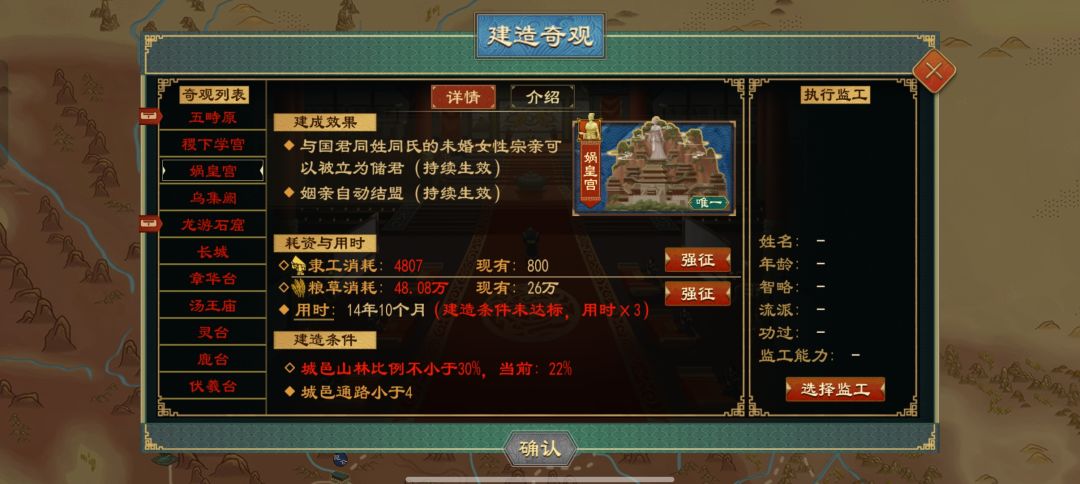 有的玩家以统一国家为主,有的玩家策反臣子为主,有的玩家以分裂国家为主,我不太喜欢强推流,为了增加游戏体验,我玩的是慢发育的,很少吞并土地。 目前我只玩春秋剧本,春秋战国 如果单纯的用间流,我建议选农家保障粮食,地形不用着急改,地形改为河15,山30,原55 玩什么剧本我都建议的操作,建造乌集阙(优先乌集阙,因为开局大家都建这个建筑你不建造别人就建造了。稷下学宫,门客待遇设为6级,人望嘎嘎高,偶遇人