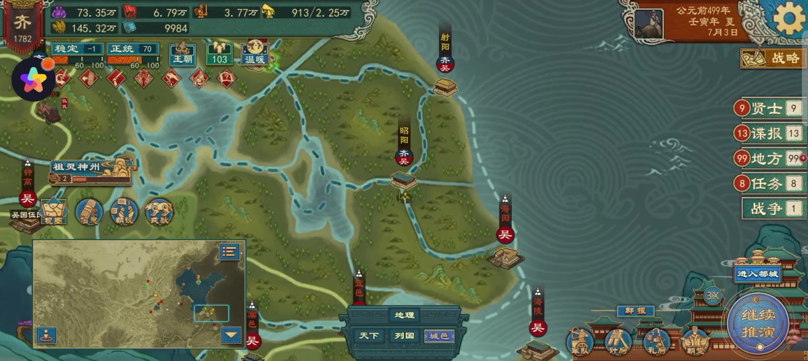一.【地图】 【地图】界面集合了国家资源、国土分布、实时任务、推演时间等各项重要内容,该界面主要用来进行一些外交类型操作以及观测国家状态和资源变动,同时游戏内使用最频繁的“朝堂”功能以及“推演”功能也整合到了该界面,方便进行操作配置。 二.【都城】 【都城】界面主要用来进行大部分国家内政和各类人物管理,相比朝堂功夫律令内的批量操作,从该界面内进入的各项功能可针对单独个体进行配置和调整,显示和操作上