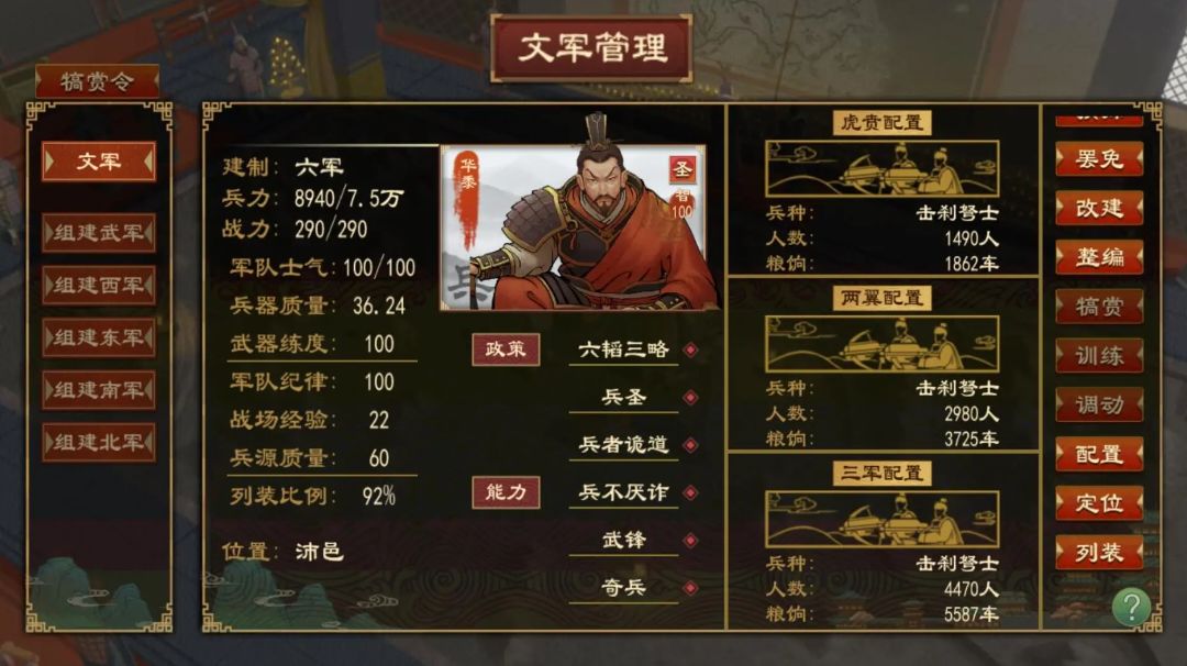 新的军队战力来源于武器练度,兵器质量,军队纪律,战场经验,兵源质量,下面分别分析如何提高军队战力 兵器质量:由武器制造国的科技水平决定,主要因素是工术与农术 军队纪律:主要由训练提升 武器练度:主要由训练提升 战场经验:每场攻城战+2,野战+2,围城战+1,敌军投降+1,每5点经验加1战力,补充新兵会降低经验 兵源质量:开局默认良家子,战争过后会短暂出现部分老弱病残,补员训练之后恢复 武器来源 市