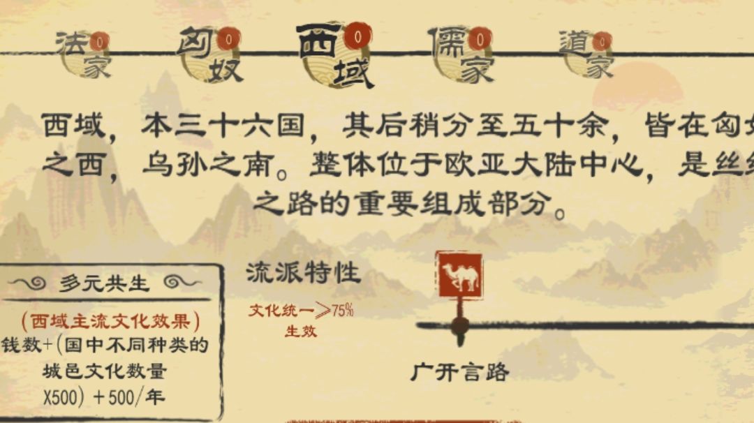 注:目前版本西域政策为半成品,具体效果请以正式上线为主 西域,本三十六国,其后稍分至五十余,皆在匈奴之西,乌孙之南。整体位于欧亚大陆中心,是丝绸之路的重 要组成部分。 多元共生:(西域主流文化效果)钱数+(国中不同种类的城邑文化数量X500)+500/年 流派特性: 广开言路:执行操作之时,所有游士都可以增加贤能,门客的贤能产+50%。 石冢墓:君主正统+1/年 竖穴墓:君主正统+2/年 二次葬: