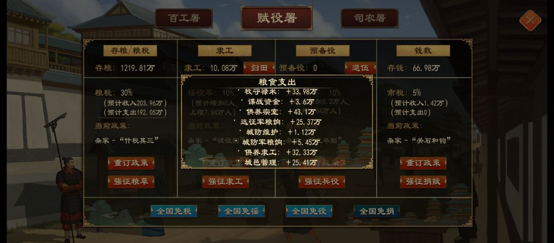 每年粮草收入主要受农田,税率和粮种产量影响,其中粮种产量可通过部分政策增加。 1.农业开发 操作路径:【公府律令-垦田令】 每次的开发将提升全国各城邑的农田,每年可开发一次。 2.调整税率 操作路径:【计府-赋役署-存粮/粮税-重订政策】 通过重订税收制度政策,可以提高国家税率,从而提高每年粮食的获取量。前期可以将税率适当调高至30%左右,在后续粮草结余较多的情况下再将其下调。 *税率过高会导致骚