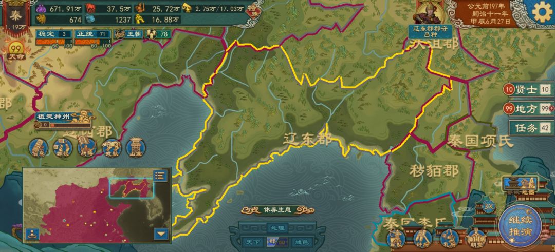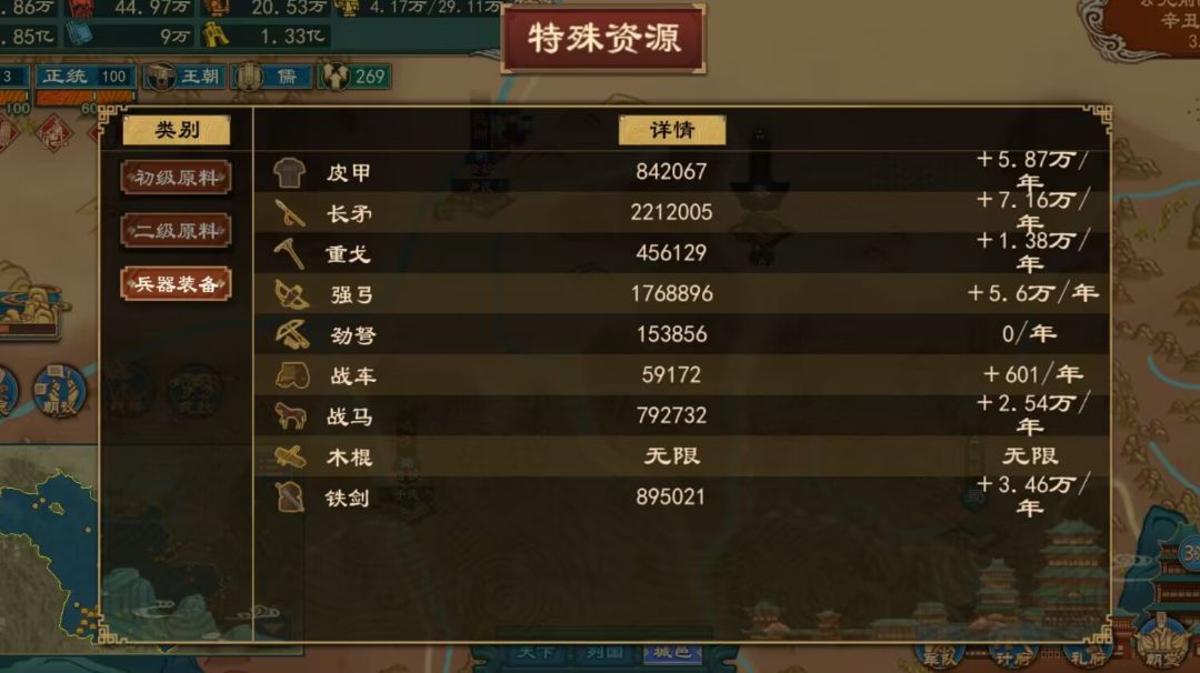 朝鲜:资源以木头为主,有少量兽皮 辽东:资源以兽,马为主,有多个大型以上兽马资源,辽东有巨型马群 辽西:拥数个中小型矿藏,种类丰富 燕北:拥有中小型铜铁银矿,其余城市也有木材,马场,兽皮等资源 燕南:资源匮乏,仅有少许铁矿,大部分以木,兽资源为主 济北:资源匮乏,大部分以木,兽资源为主,有少许漆,铁 山东:西部有大量漆,南部有中小型铜矿,含少量铁银矿,东部富金矿,莱阳有巨型金矿,其他地区以木材,兽