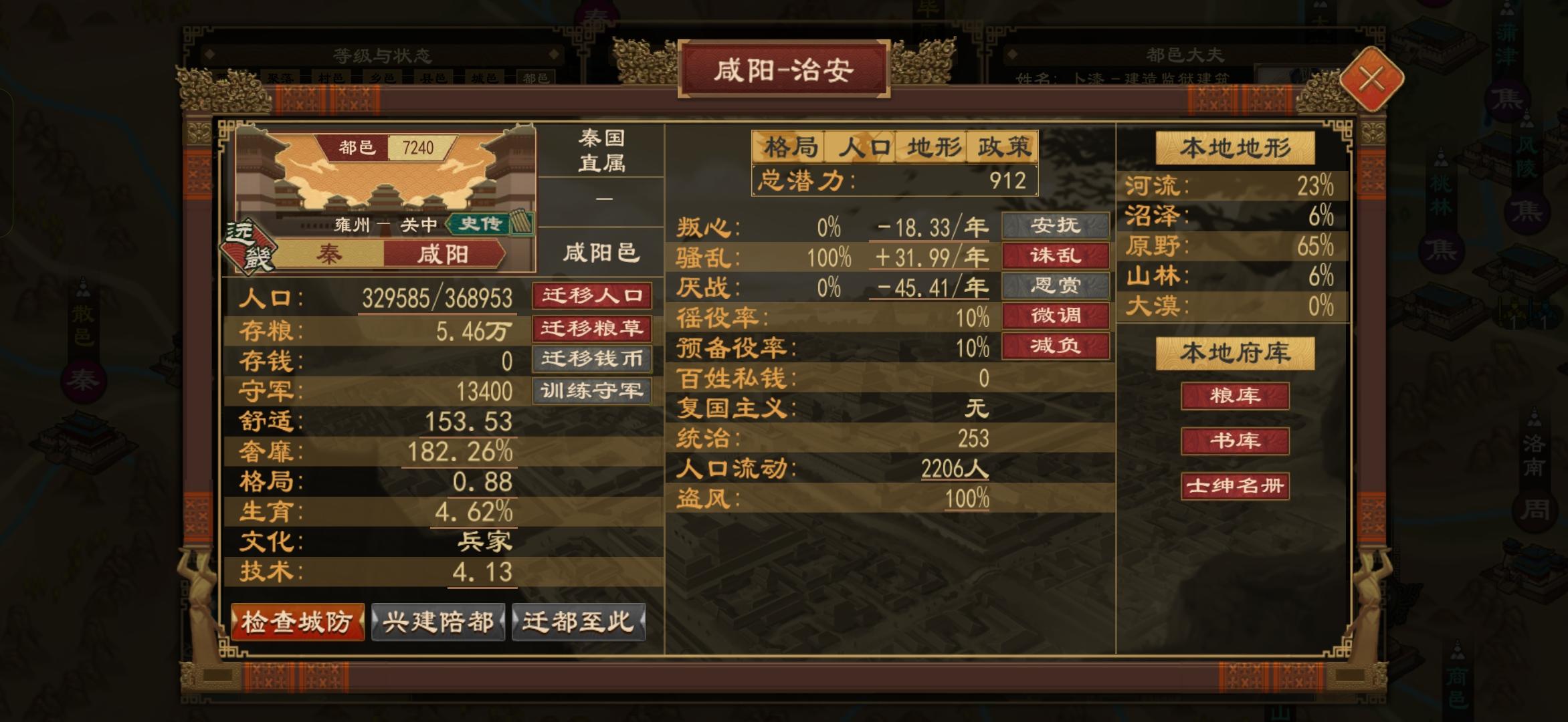 开局攻略: 选择大国,强行征兵至上限,除都城外全部分封,然后还兵于民,迅速暴民,家国一体的buff后,切入法家,点农家施政,许行必带同时修水利加都城太守(加百分三十粮),惩罚过错朝臣增加稳定。 兵家、儒家减复国、农家必点,玩简单难度可以不点墨家。 义性格的墨家邦士(培养或者策反至少搞到一个)去挖兵不厌诈,政策破百后,切入儒家,商鞅会出手洗文化。 号养好后,人才全转儒家,带兵不厌诈宗亲转兵家,一边刷