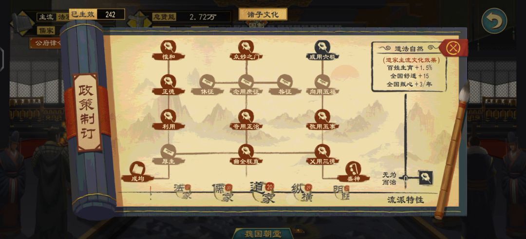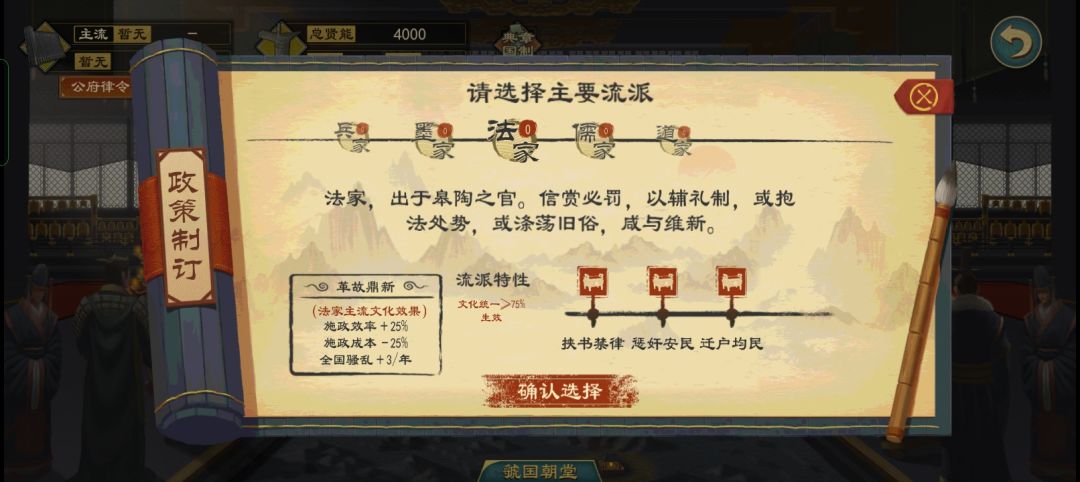 流派先选法家,优先点收诗书,百揆。等文化顺流>75%时打开惩奸安民,换掉过大于功的朝臣点政策,换掉的朝臣建议入狱,偶尔可以处死20过错之内的朝臣加稳定(20过错以上不加稳定)。 点完所有法家流派政策获得法家精神,即可在一百年内不玩法家改革典章国制。 再利用换人点想要玩的流派的部分政策加快洗文化速度,去大牢把所有一次性用品处死刷到君威,最后换该流派,法家政策会悉数被废除(除朝臣自带以外),不用担心法