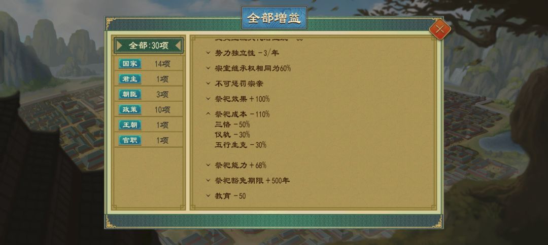 在本次“夏乐商祀”版本更新中,升级现有的祭祖功能以及新增宗庙功能,在君主获得谥号后,其牌位会被供奉在宗庙中。玩家可以设立庙主,通过祭祀获得庙主谥号的对应效果。在都城-庙宇-列祖可查看所有的宗庙牌位。 值得一提的是,在-1042年后获得的牌位,其名称将显示为国名+谥号+爵位+人物的氏+人物名;其余时间获得的牌位,其名称显示为国名+“氏”+名,例如“秦孝公赢渠梁”和“周氏昌”。 一、祖始庙 庙主需为代
