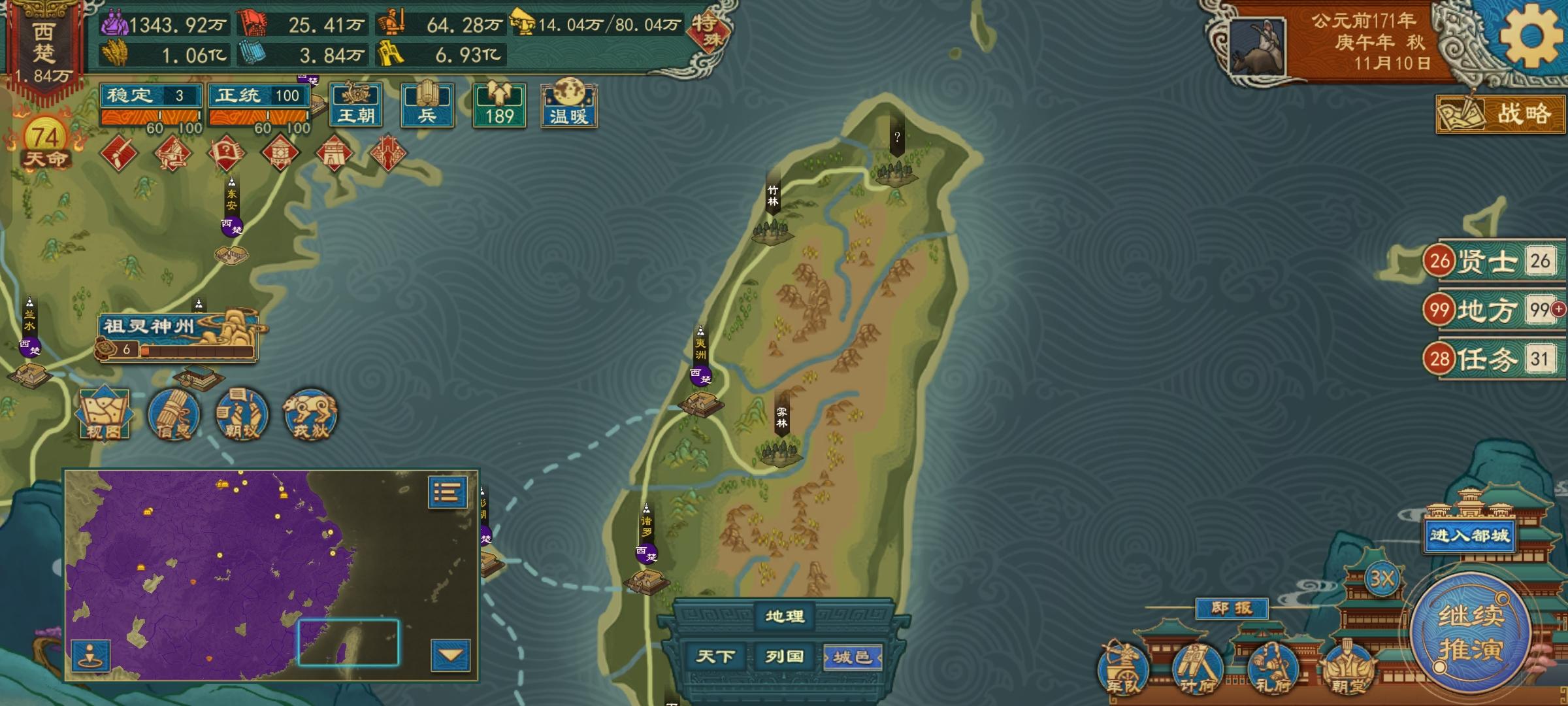 兵家流派,默认设置,默认配置,二星难度秦国。200年整众正盈朝,就是劝进完成之后游戏就结束了,还剩下五个外放公卿势力没法收回来,污染了我的地图,有点小遗憾。(其实儒家更简单,政策优势大,第一次玩首推儒家) 那个章国典制想改革的话只能在开局改,开局选兵家主流,把顺流和国威、正统、稳定刷满后马上改,就可以提前拿下郡国并行制和将佐制,多建几个军队,否则多线开战的时候预备役够但军队数量不够就很难受。不然就