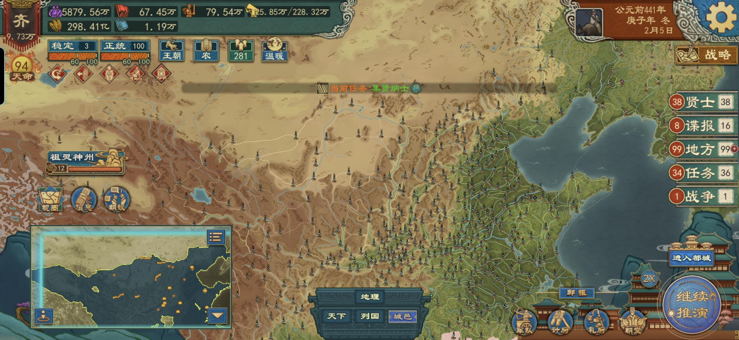 1.开始游戏2.选择剧本年代-上古等3.选择角落国家(非四面都有国家,打架起来,不能发育)4.发育篇:4.1 直接去驿站找游女,多找几个结婚,后面可以给兄弟封地(旁观者模式没用,AI自毁流放),【分封封地作用:分割战场,避免1打多,避免自己领土与多个国家接壤导致冲突打架,前期最重要的是发育。】4.2 招贤臣,集贤-招募令这里10连抽梭哈,有2-3个紫色就行了,前期顶用,后期发育起来绿色的