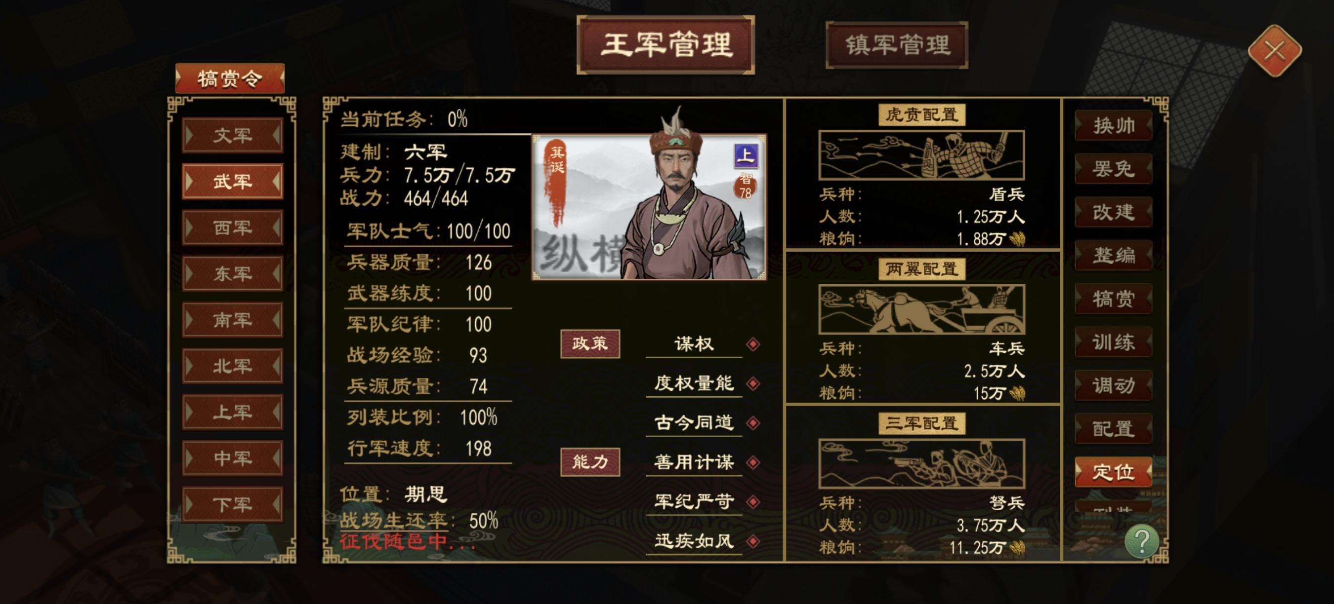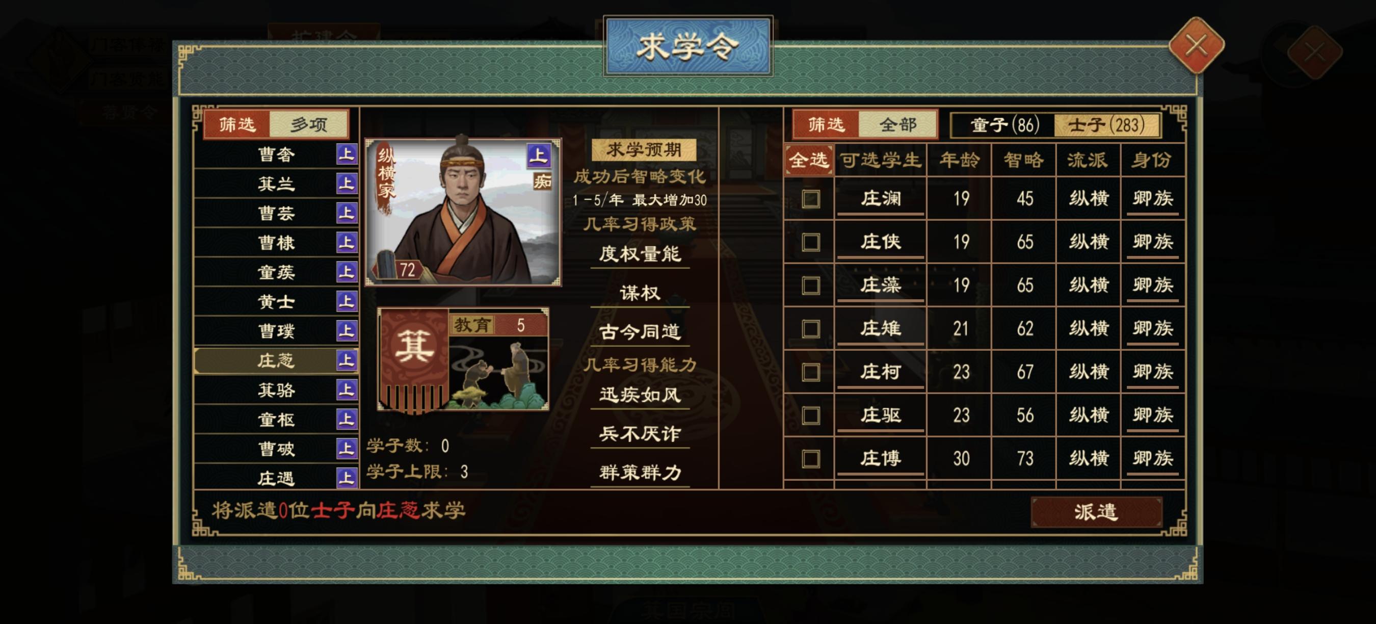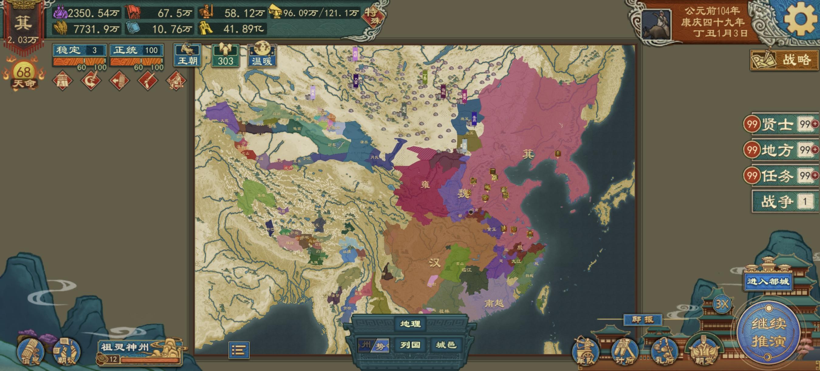 1.开始游戏2.选择剧本年代-上古等3.选择角落国家(非四面都有国家,打架起来,不能发育)4.发育篇:4.1 直接去驿站找游女,多找几个结婚,后面可以给兄弟封地(旁观者模式没用,AI自毁流放),【分封封地作用:分割战场,避免1打多,避免自己领土与多个国家接壤导致冲突打架,前期最重要的是发育。】4.2 招贤臣,集贤-招募令这里10连抽梭哈,有2-3个紫色就行了,前期顶用,后期发育起来绿色的