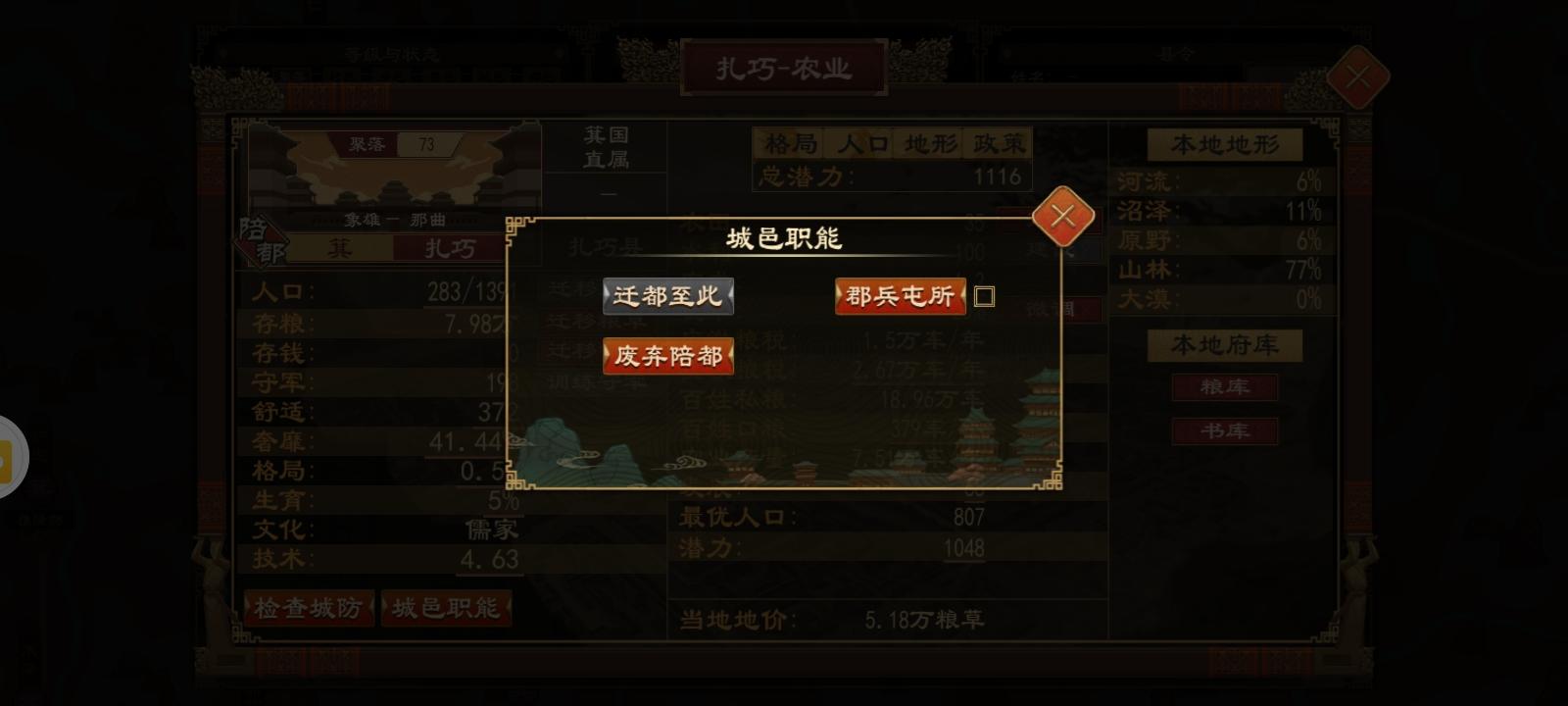 更新后,陪都建成后想要迁都,像原来那样走流程发现没有迁都按钮了……于是上TAP想要在攻略和论坛里面搜搜怎么个事,结果搜不到……以为更新后不能随便迁都和建立陪都了,抱着死忙当活马医的态度随便点了点。。。 …我靠迁都和建立陪都的功能迁到“城邑职能”这个新功能里了😅
