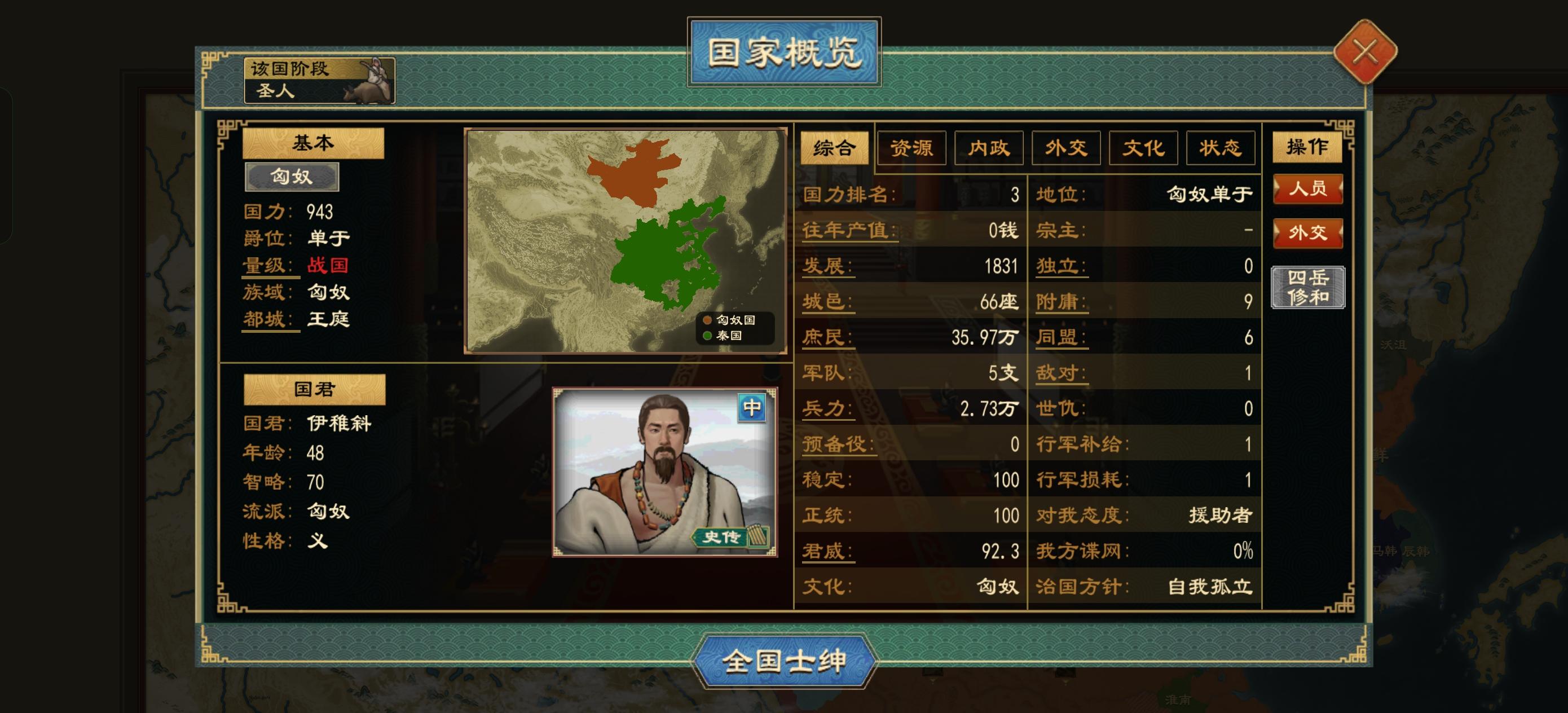 西汉的几个剧本包,建议全面加强下匈奴这些游牧国家,增强代入感,比如汉匈战争的剧本,总不能让匈奴还像楚汉剧本里面那样,几十万人口,十来万兵,从头苟到尾吧,本来全图就没几个国家,要是还这样,就太没意思了,希望官方能好好考虑下。加强的方面,建议提高游牧势力特殊兵种的实用频率、同步增强匈奴的进攻欲望,能压着大汉打几十年的匈奴,多出现点特殊兵种很合理吧。还有就是,建议给匈奴增加类似兵家劫掠的特性,不定时