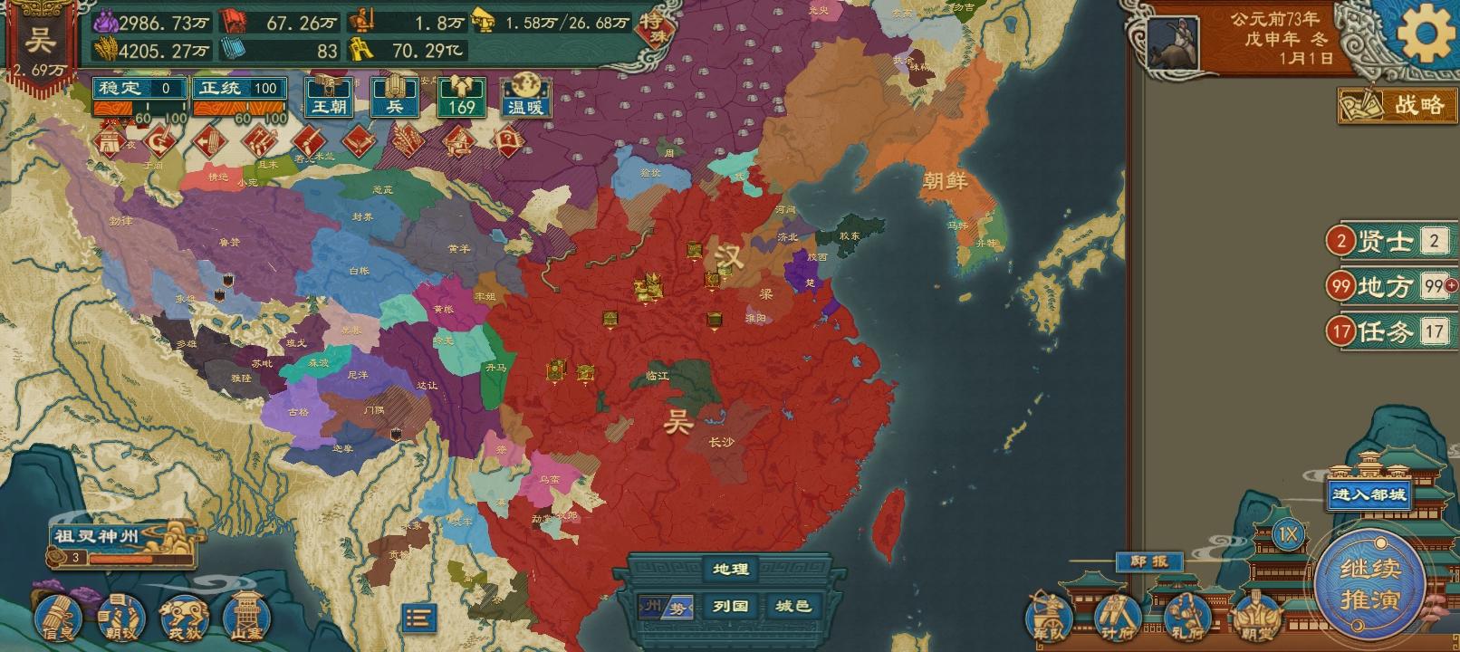 每次用名分(统一四海),以小博大,一下子吃撑了,复国,判心,骚乱都还能忍,粮食收不上来啊,要过多久才能收上来啊,不然国家体量到了,只能用统一名分,兼并名分时间太长,打起来太心累了,每次这样都想放弃存档了