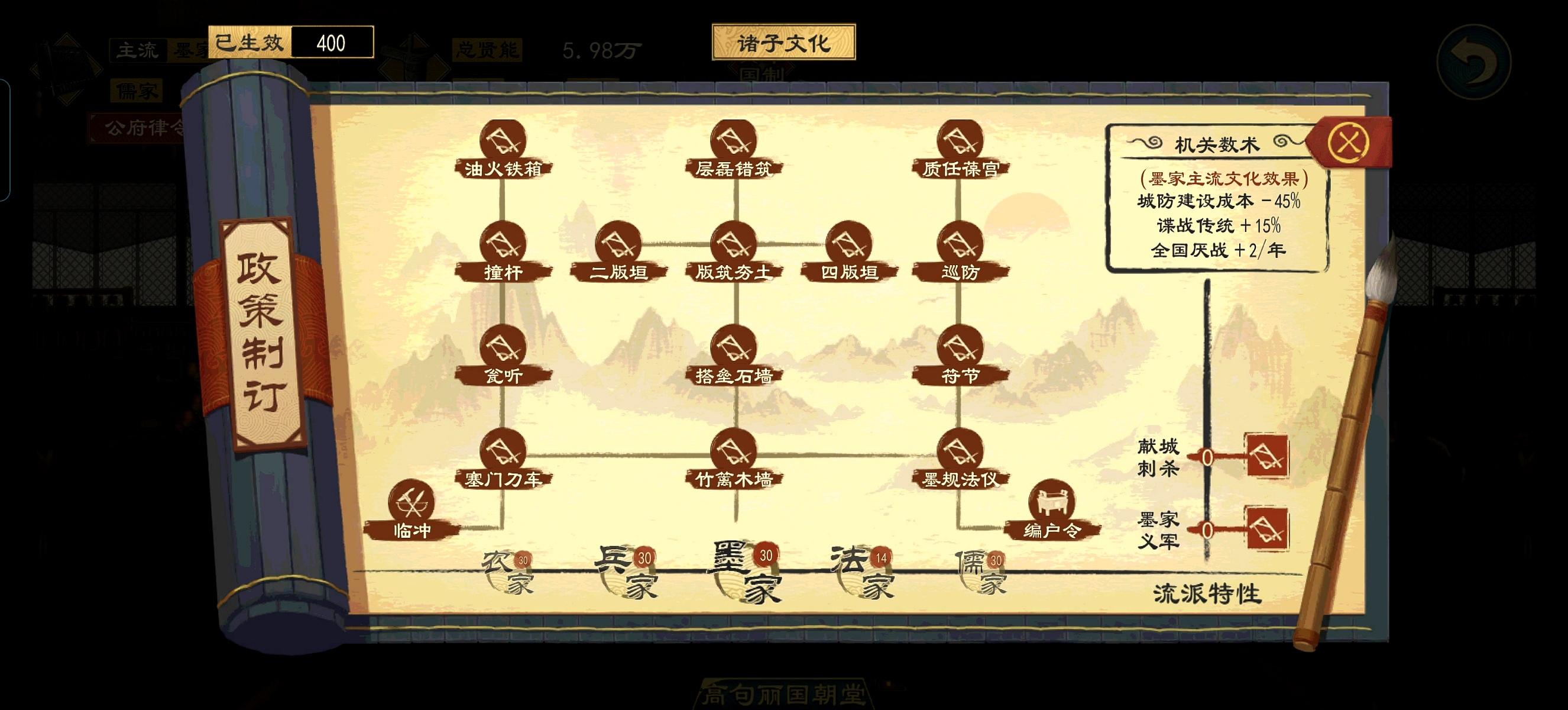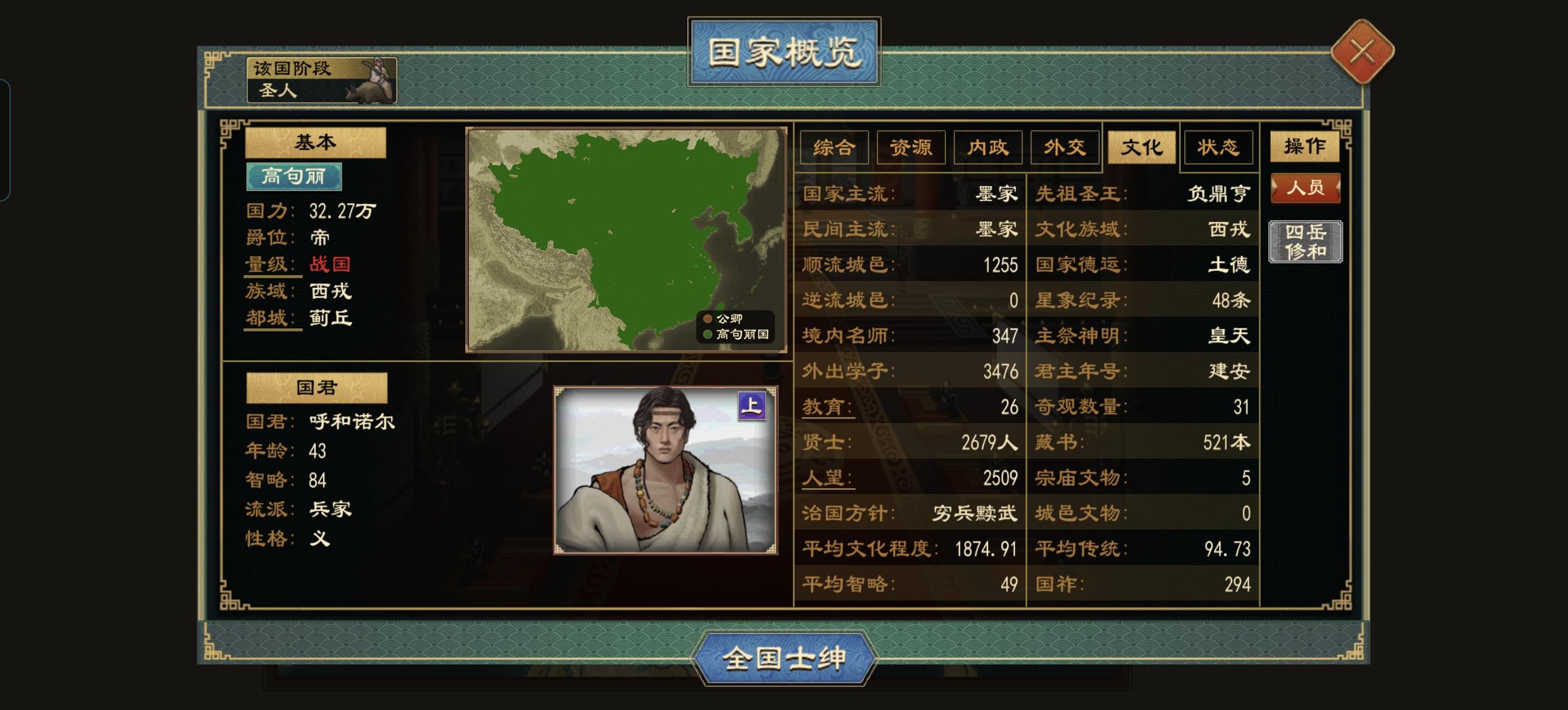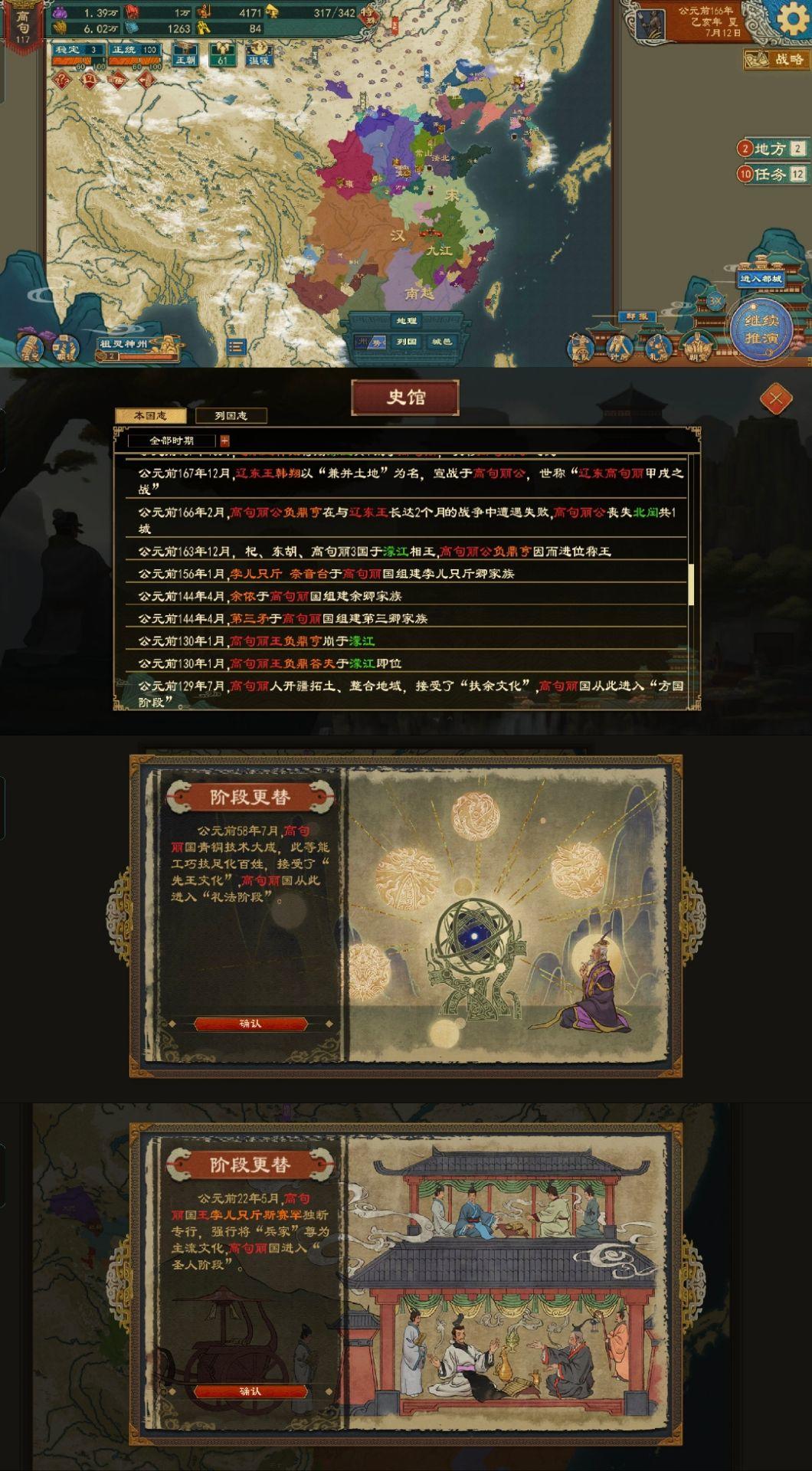 策划大大好,现就秦汉剧本提出以下优化建议:当前君主仅称“帝”,缺乏“皇帝”这一核心尊号,导致玩家体验上更像战国诸侯王,难以体现秦汉大一统君主的至高地位。建议将君主尊号正式改为“皇帝”,以契合历史设定。同时,建议强化文明发展阶段的视觉呈现。游戏从“圣人阶段”进入“国族阶段”后,应逐步体现权力升级。当国家达到秦汉一统水准时,即便量级仍为“战国”,也应在UI上显著区分——如皇帝启用专属称号样式、界面