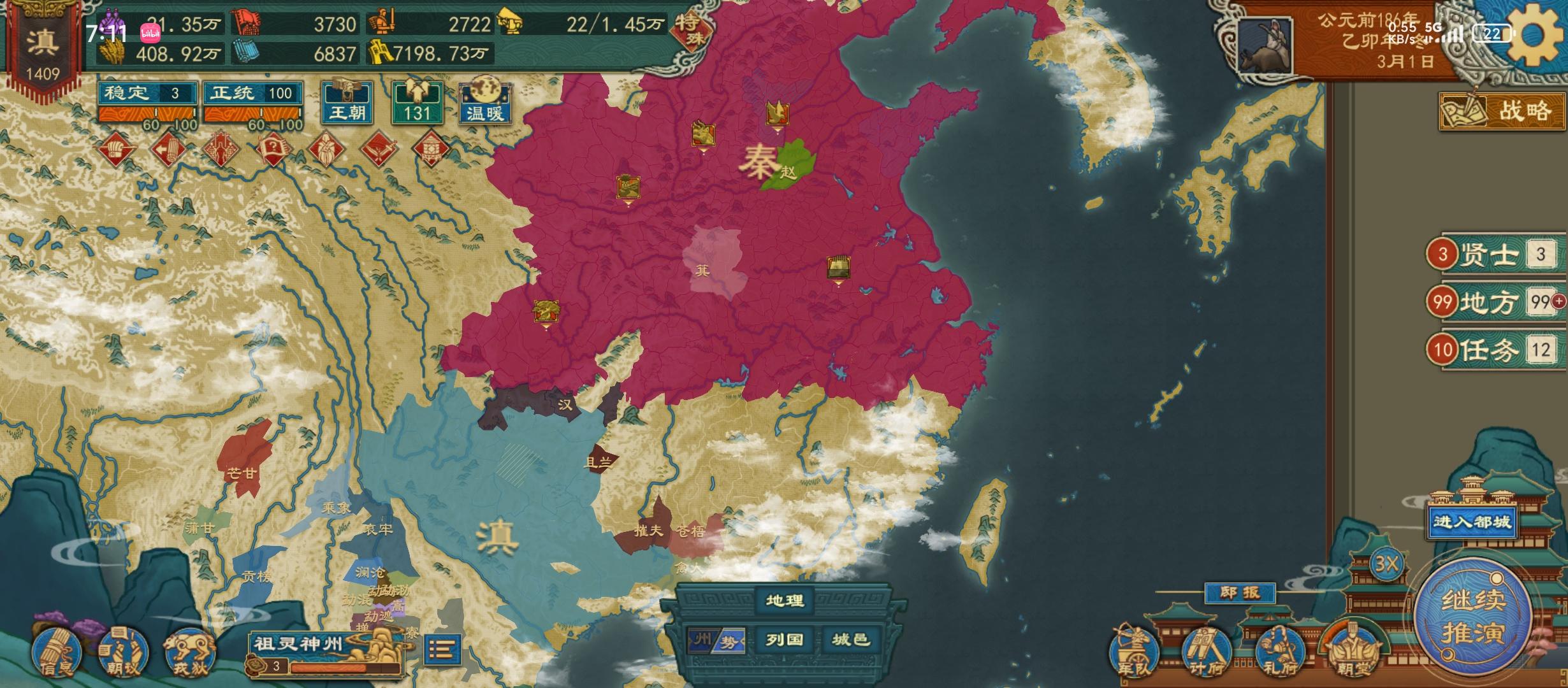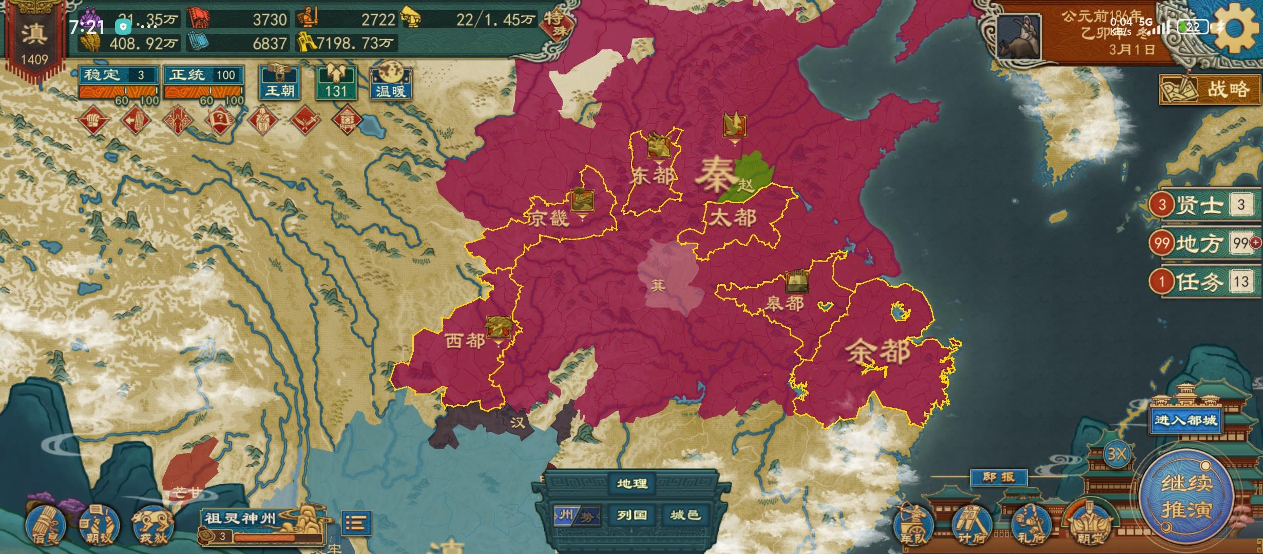 策划大大好,现就秦汉剧本提出以下优化建议:当前君主仅称“帝”,缺乏“皇帝”这一核心尊号,导致玩家体验上更像战国诸侯王,难以体现秦汉大一统君主的至高地位。建议将君主尊号正式改为“皇帝”,以契合历史设定。同时,建议强化文明发展阶段的视觉呈现。游戏从“圣人阶段”进入“国族阶段”后,应逐步体现权力升级。当国家达到秦汉一统水准时,即便量级仍为“战国”,也应在UI上显著区分——如皇帝启用专属称号样式、界面