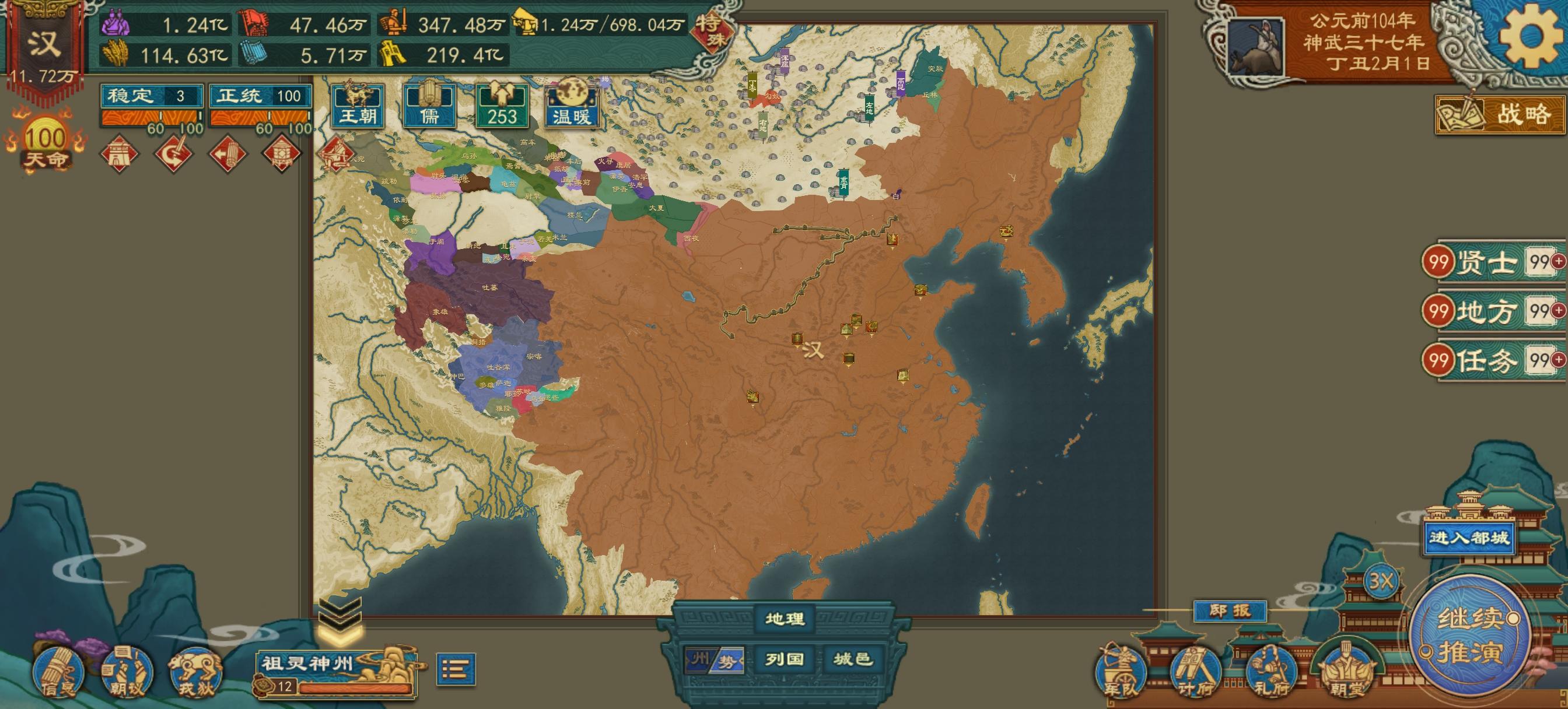 策划大大好,现就秦汉剧本提出以下优化建议:当前君主仅称“帝”,缺乏“皇帝”这一核心尊号,导致玩家体验上更像战国诸侯王,难以体现秦汉大一统君主的至高地位。建议将君主尊号正式改为“皇帝”,以契合历史设定。同时,建议强化文明发展阶段的视觉呈现。游戏从“圣人阶段”进入“国族阶段”后,应逐步体现权力升级。当国家达到秦汉一统水准时,即便量级仍为“战国”,也应在UI上显著区分——如皇帝启用专属称号样式、界面