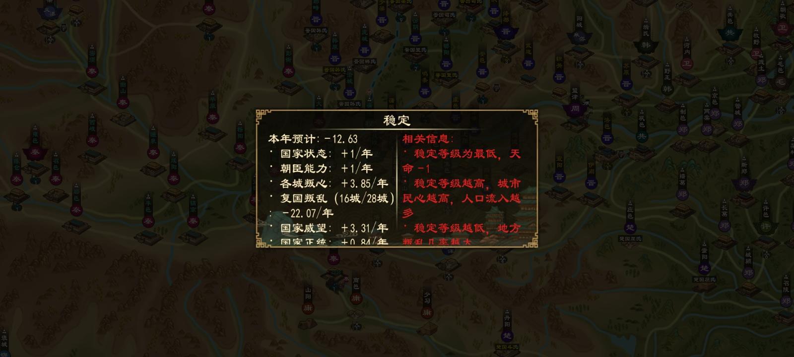 图上一共卿室36个,但之后又放了几个,主要是复国原因还有我不想用减复国政策文物。碎卿的征服效果很双标,每个卿室后期都能养出6军队,综合一下军队数量破百,并且碎卿的分军队培养欲望高,占全国一半城池并贡献了全国三分之二的军队,但是也有弱点,敌方弱的时候一窝蜂全来了,我甚至能看见稀有的38支军队停在一个城上,但敌方强的时候全缩家里,打个陆浑过两年了没一个出兵的,还得我打下对方都城了才稍微出几支。但最关键