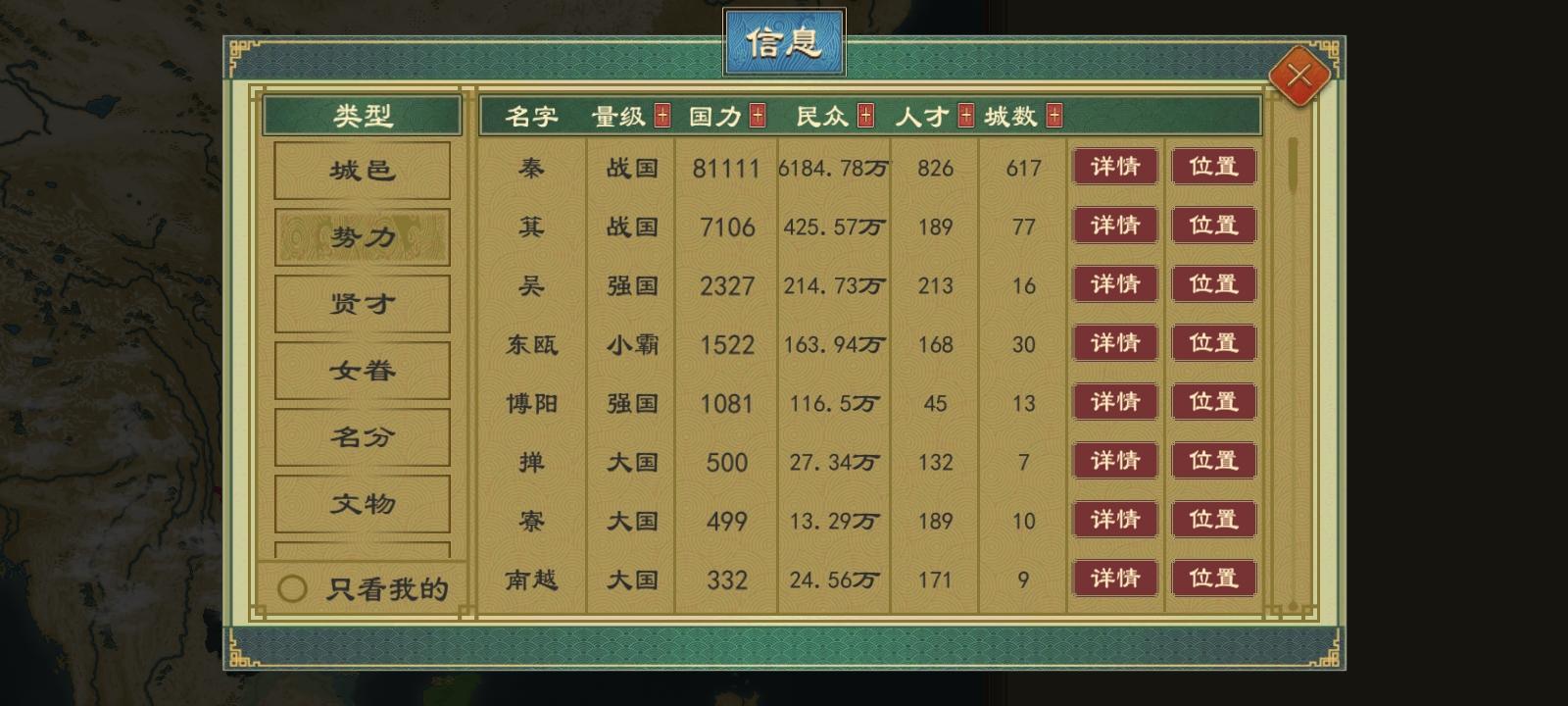 这让卿室上位还挺麻烦,不仅正统底于60以下,无宗室子弟继承(公室也不行,多了诸子之乱,少了正常继位),就算只剩下了卿室,如果有同姓但不同氏卿室,那就只呈现同姓的,图里就只呈现了子姓的乐氏、皇氏和华氏,没有嬴姓赵氏(无论有没有血缘关系,只要同姓就会显现),我还是把那几个同姓全部流放了赵氏才显现了(话说最后那张图是我君主死在遗迹后,我暂停了一会他就直接变成正卿了???)p