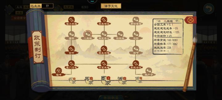 点击计府左上角“建筑计划”按钮,可以进入建筑计划界面。已设计的建筑计划会出现在表格中,在右下角可以制定新计划、修改或中止已有计划。