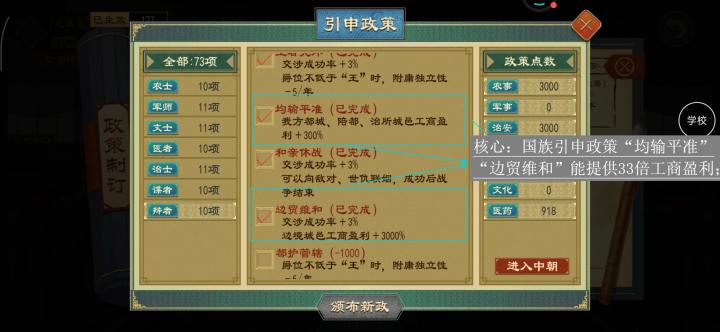 弄点加强方案(许愿单)①完全由中夏国家占据且平均统治超过10年的州域提供20%的行军速度加成②分裂、分封的国家可以继承母国的任何阶段的政策(不包括引申政策)③地方官俸禄-30%,治理效果+20%④全国格局+0.2⑤国君寿命+5年⑥城市等级上限+1,管理费+20%