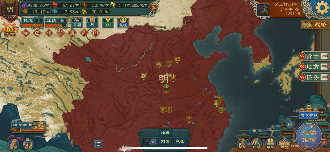 开了两次都是打到大后期(都是七国剧本,一次用燕开局,一次用齐开局,主要是想要圣人阶段能快速完成华丽转身),地图基占了,后期反复操作真的很烦!一直找人给填县令、郡官员。。。每个月都有死的,每年出生的卿族、宗亲要安排学业,的从霸主纪元到郡县纪元几十年,后期除了南边像豆腐渣的异族根本没什么好打的了,其本就是反反复复操作,麻了。游戏也就开始的时候有点意思,相王后趁地图上有合纵其他国的时候,两队兵不厌诈来个