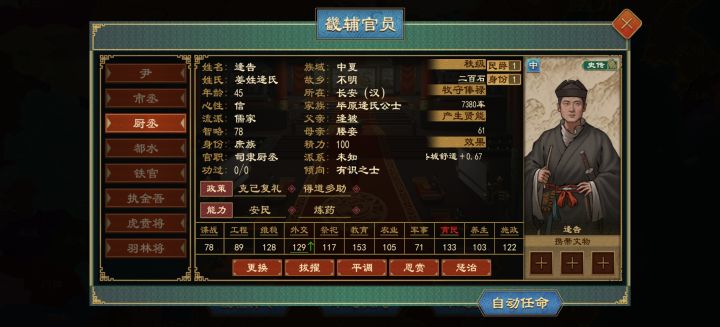 令尹制令尹:实施各种已解锁的政策司败:教育+施政 效果:减全国骚乱(最大为-14)大尹 :施政 效果加施政效率(最大为+28%)左徒:施政 效果:令尹+增加贤能产出(最大为+20%)莫敖:维稳+外交 效果:减附庸独立性(最大为-7)三阁大夫:祭祀 效果:加国家正统(最大为+14)工尹:工程+育民 效果1:加全国城邑格局(最大为+0.35)[不开启战力资源系统了效果2:加