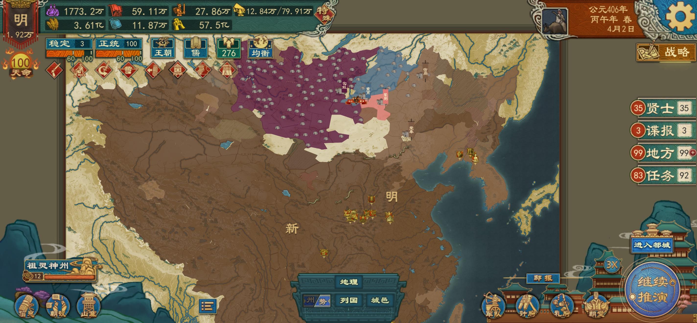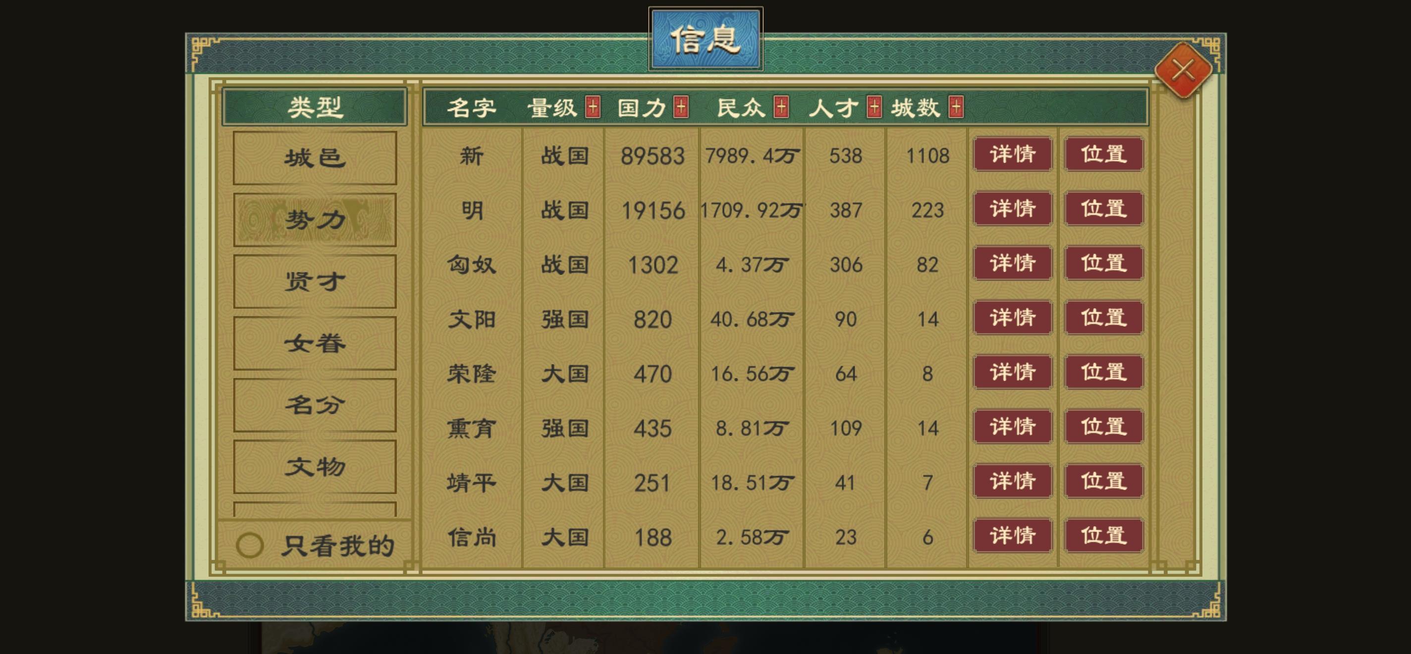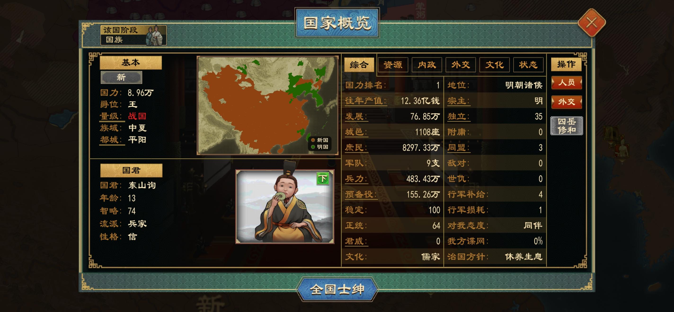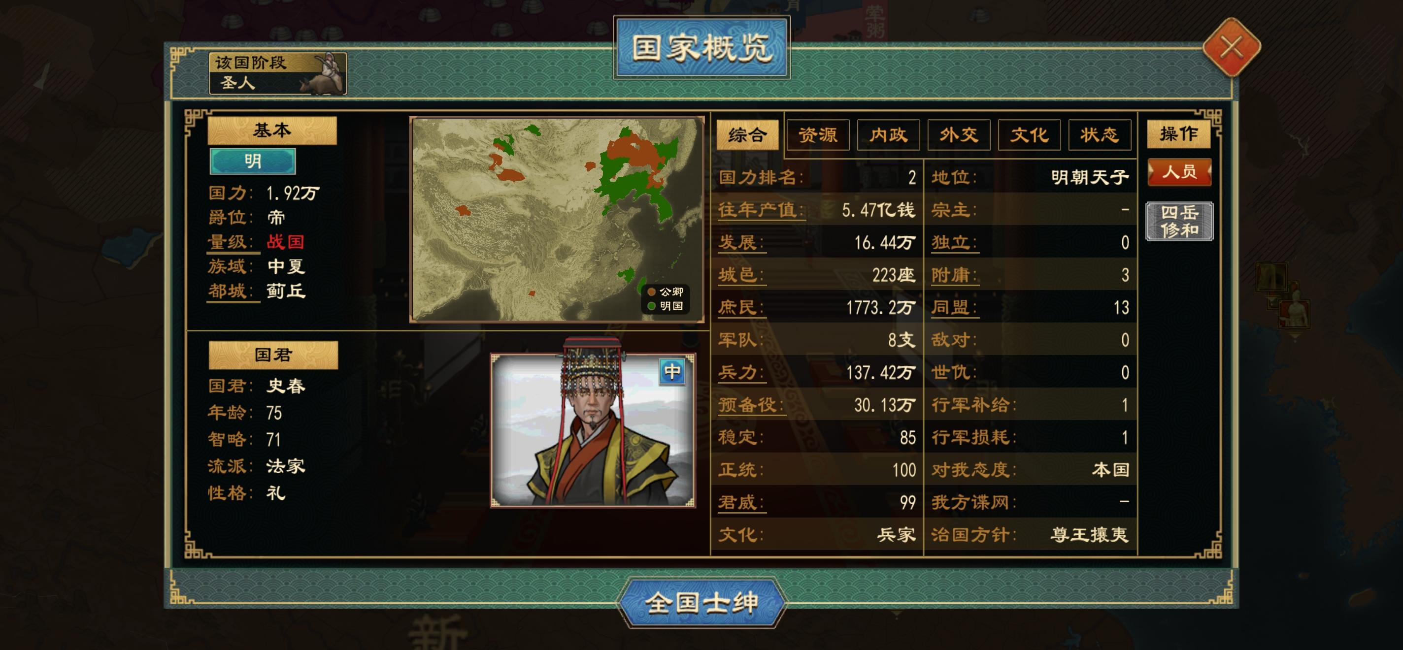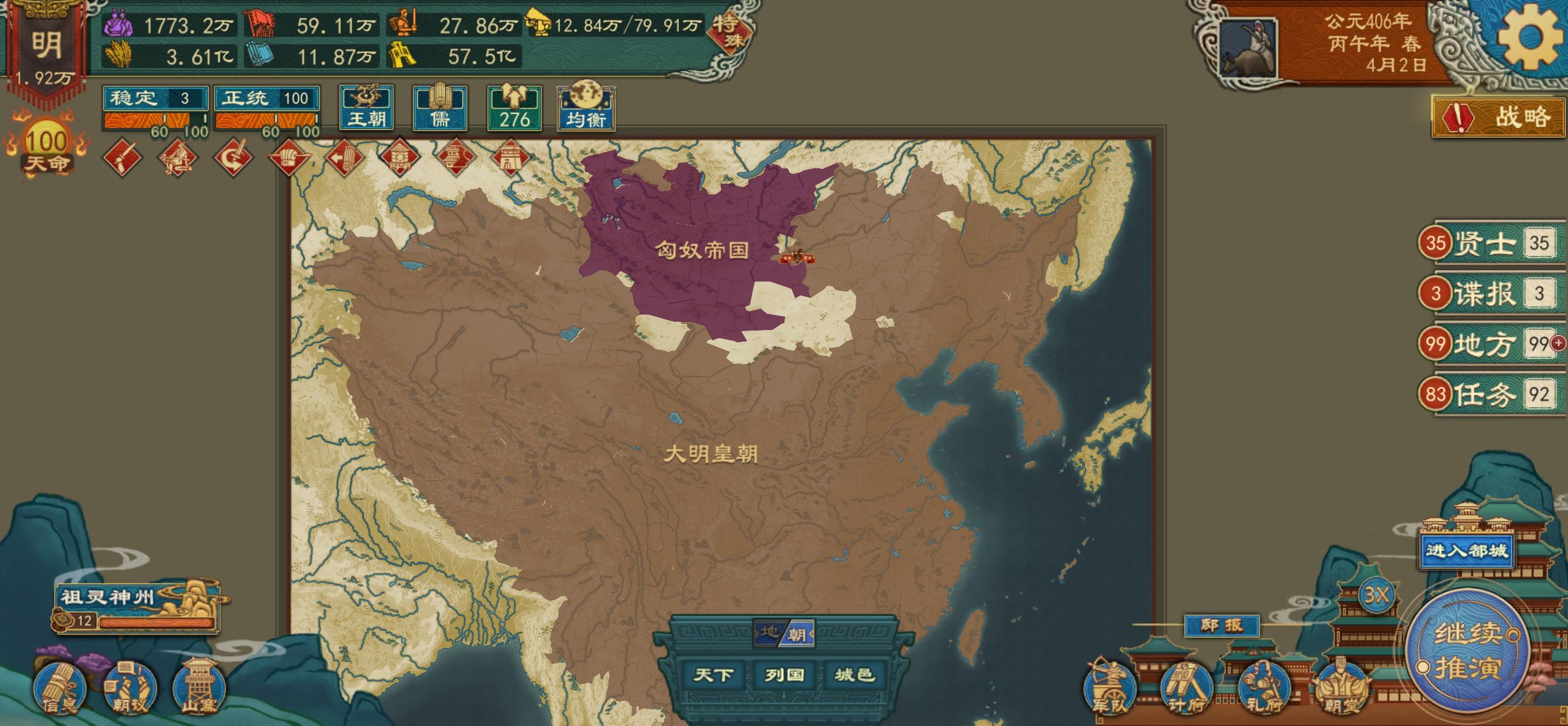 每次用名分(统一四海),以小博大,一下子吃撑了,复国,判心,骚乱都还能忍,粮食收不上来啊,要过多久才能收上来啊,不然国家体量到了,只能用统一名分,兼并名分时间太长,打起来太心累了,每次这样都想放弃存档了