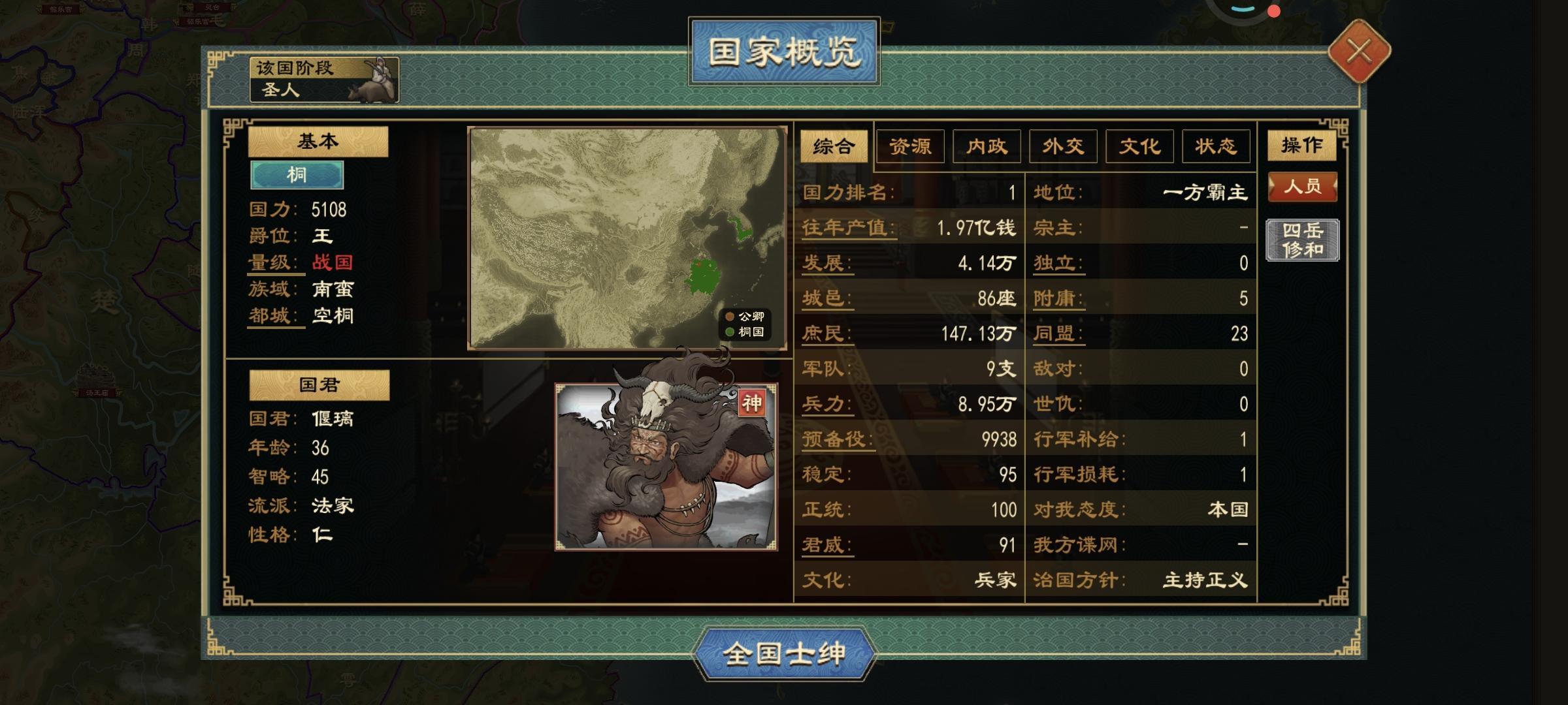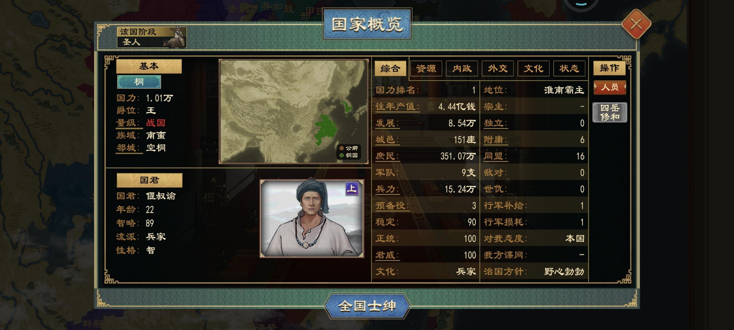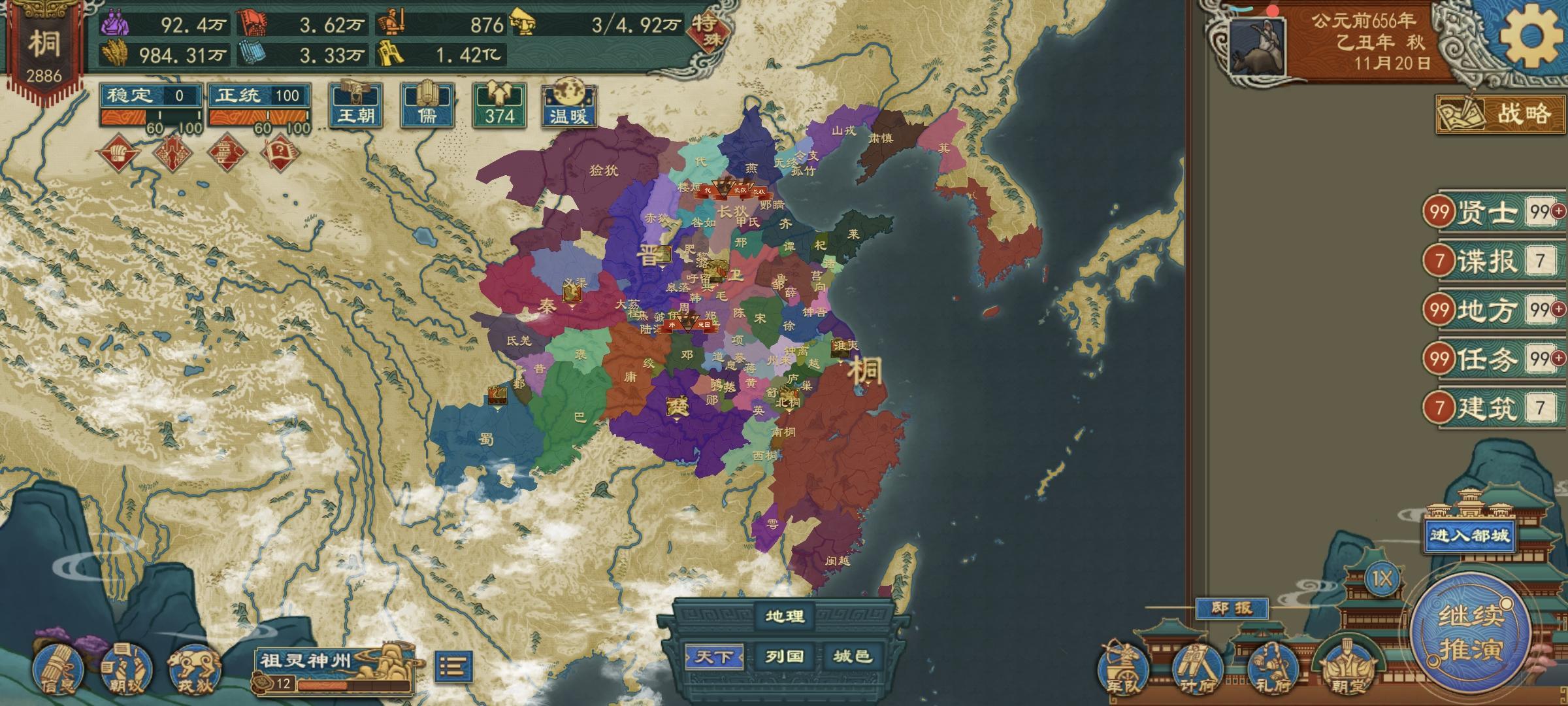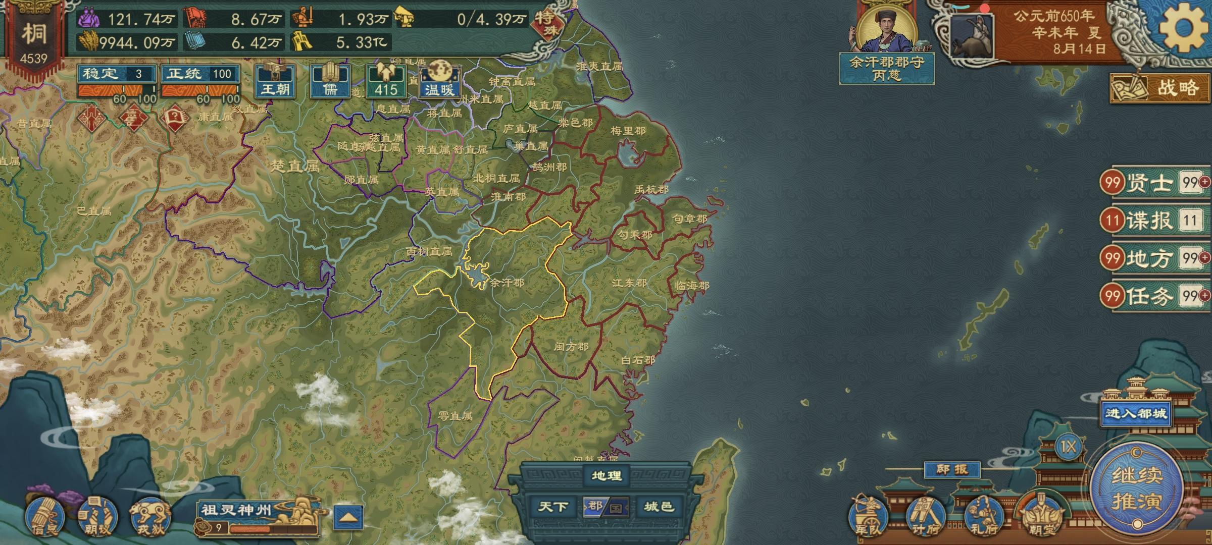 众所周知,去年7月推出来的国族阶段,到现在已经三次大更新了。现行国族阶段已经有满足货币俸饷的条件了,就是必须要点辩者的边贸维和和均输平准,再加上本次更新出的工商集聚和都邑市坊的buff。首先编制州郡,找到桑树和盐矿资源,按照储存量生产丝绸和食盐,然后在这些城的边境分封藩王,出镇藩王,税率可以拉到厘金关赋这个20%的率,就能做到货币俸饷改革的条件了。北方丝绸并不多,桑丘、顿丘、城濮、聂北、太康、商