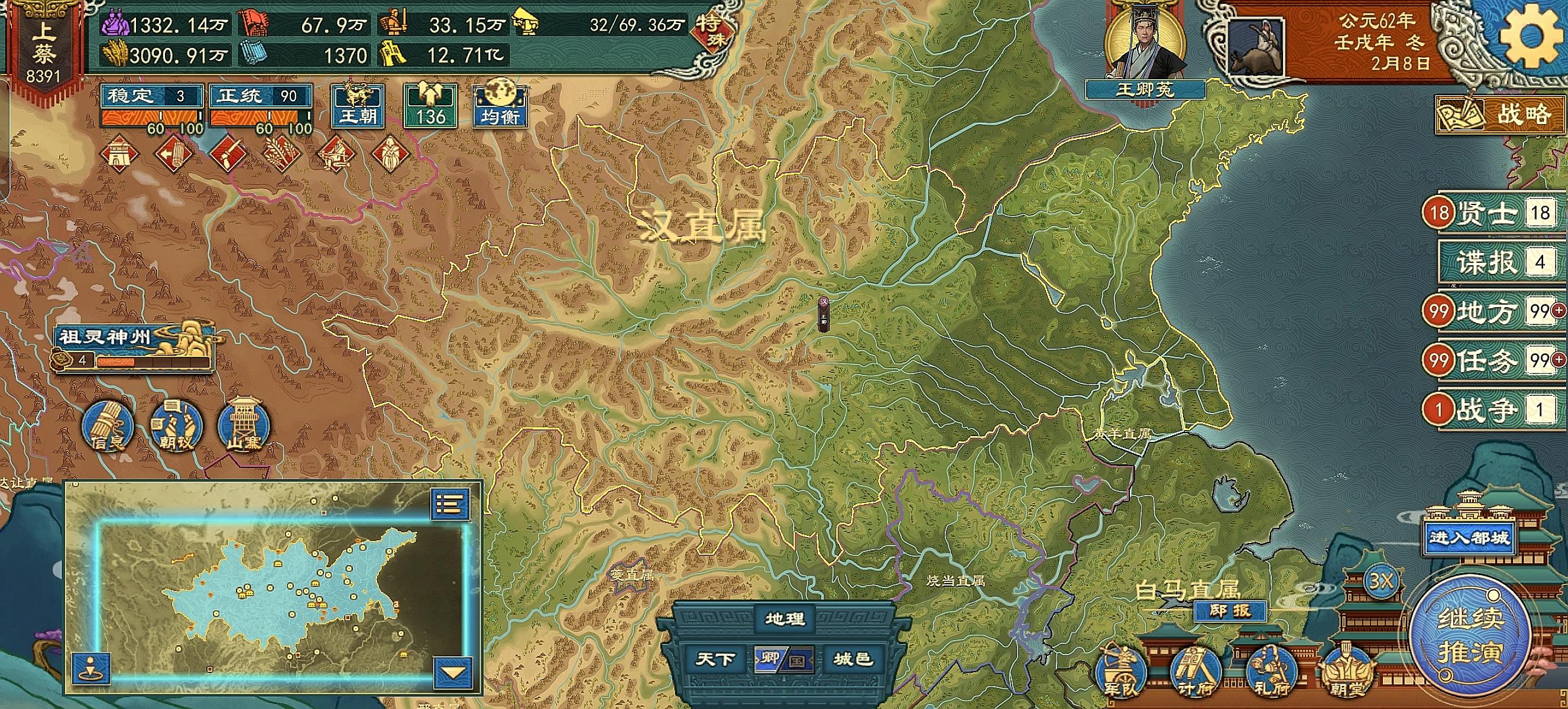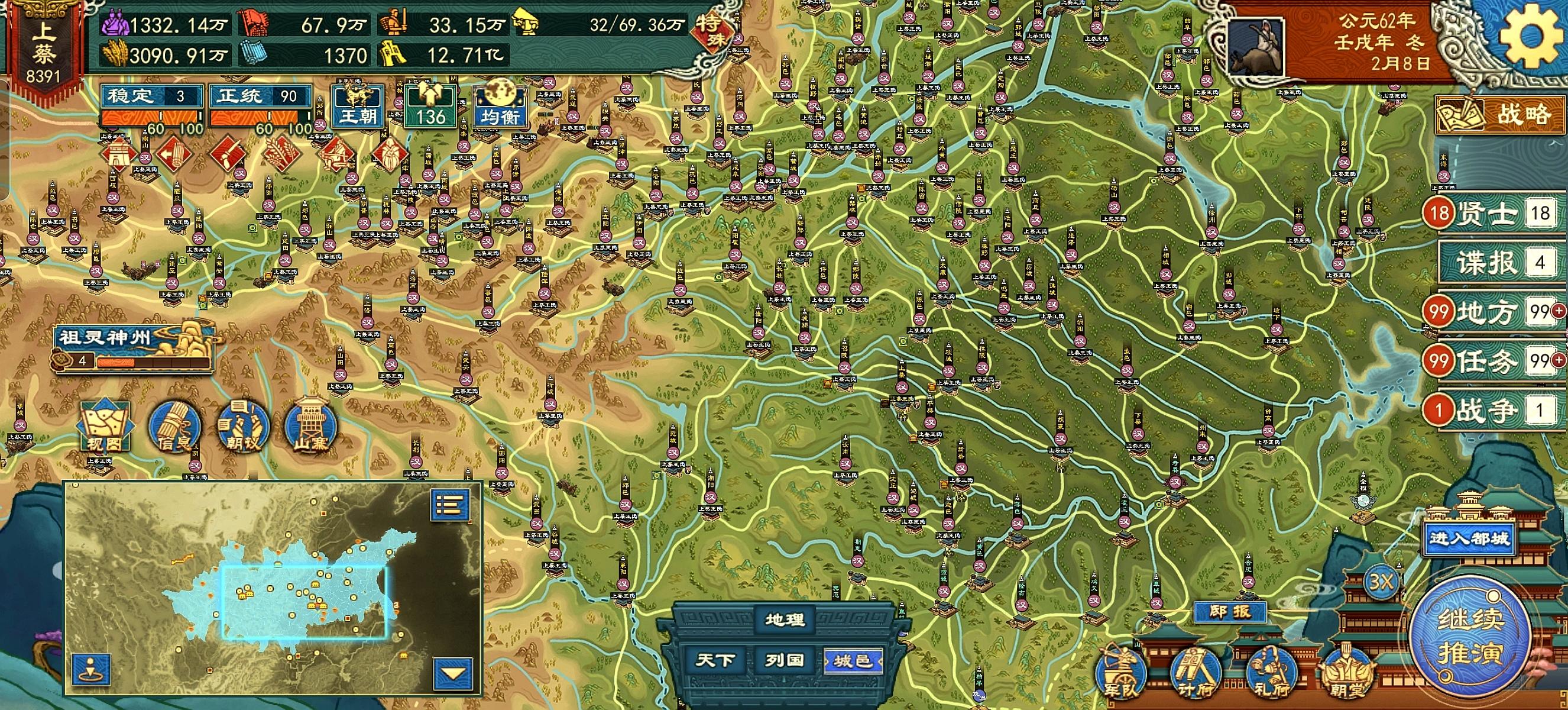 众所周知,去年7月推出来的国族阶段,到现在已经三次大更新了。现行国族阶段已经有满足货币俸饷的条件了,就是必须要点辩者的边贸维和和均输平准,再加上本次更新出的工商集聚和都邑市坊的buff。首先编制州郡,找到桑树和盐矿资源,按照储存量生产丝绸和食盐,然后在这些城的边境分封藩王,出镇藩王,税率可以拉到厘金关赋这个20%的率,就能做到货币俸饷改革的条件了。北方丝绸并不多,桑丘、顿丘、城濮、聂北、太康、商