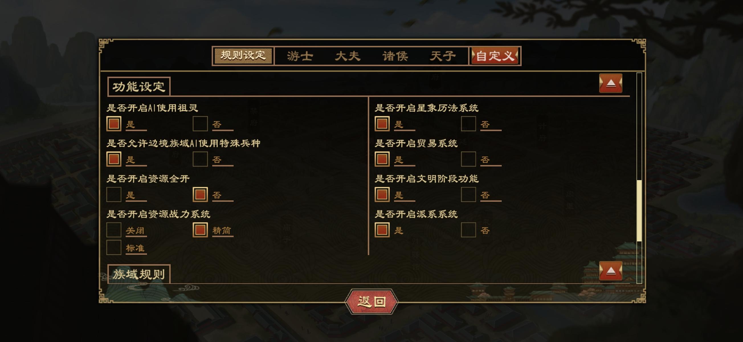 已经到国族阶段了,但是没有派系功能,该开的选项都开了啊,而且也没有禁军系统,为什么?