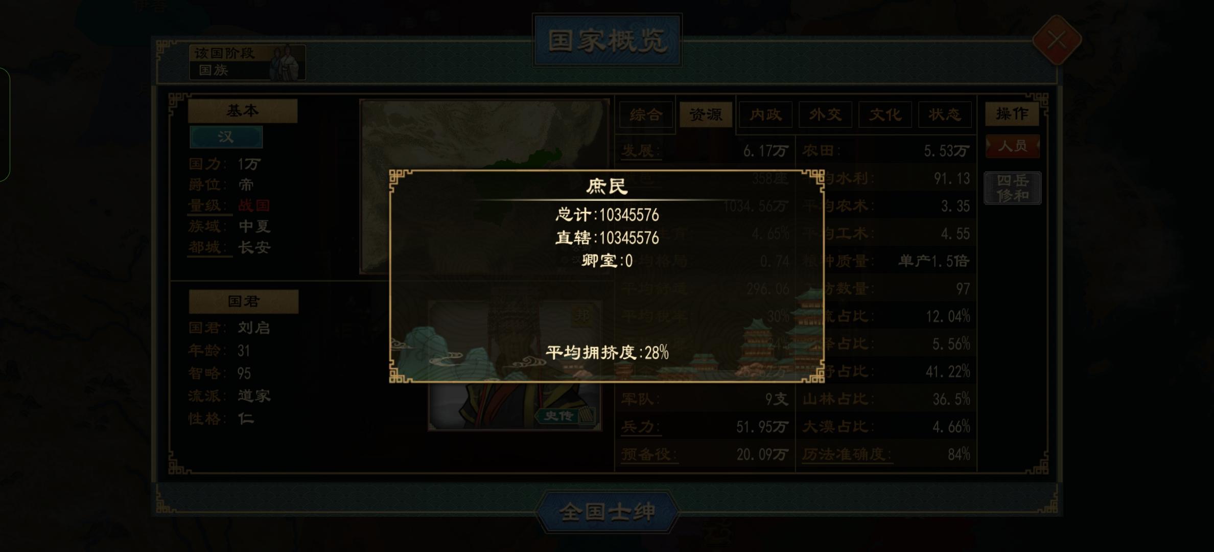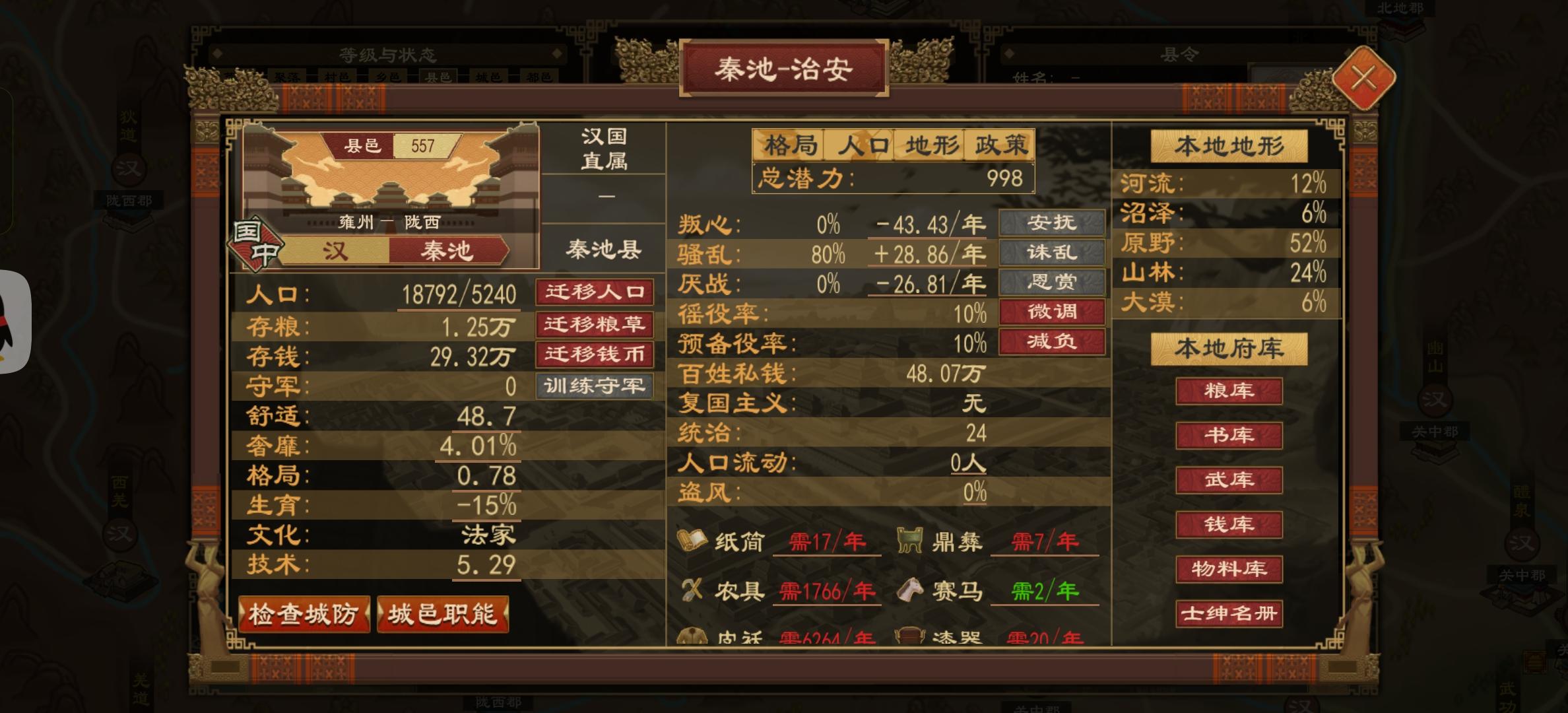 图一我发现这座城超出人口上限太多了,用了法家编户齐民,结国还给我加一千多?这对吗这对吗?第三张是目前的拥挤度,城池是秦池