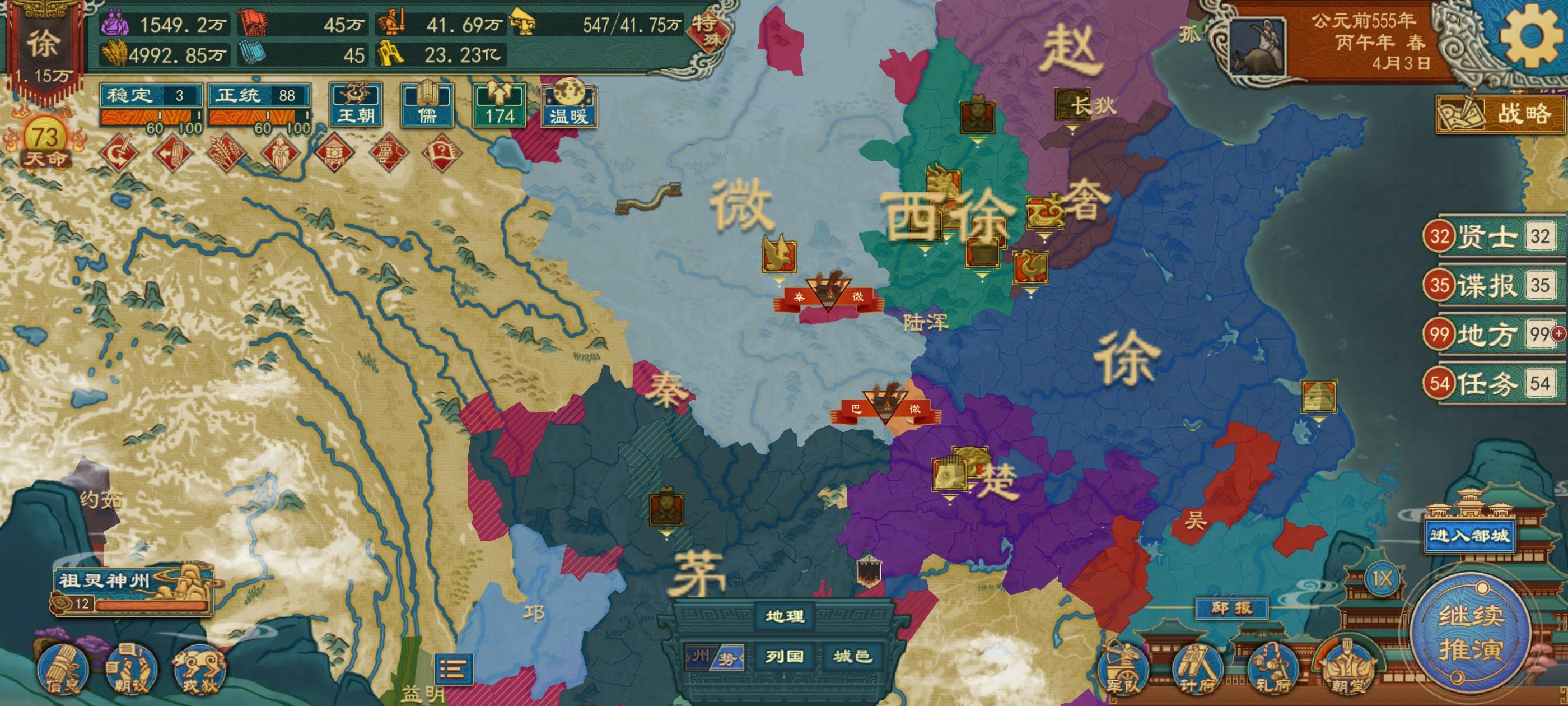如图所示,连着玩了两个档都遇到这种情况就是ai不再扩张,玩到一半推演到某个时间节点后世界上除了晋国之外,几乎所有国家都不在对外进行战争了,连着种了十几年的田,自己不发动战争#,世界就是一片和平,这还玩什么呀。上一个档更狠连着二三十年世界一片祥和除了最强大的周国,其他所有国家都不再动了,现在开新档又遇到这种情况。本来就是因为西汉本太无聊才玩春秋,结果辛苦发育上百年又遇到这种情况,太恶心了
