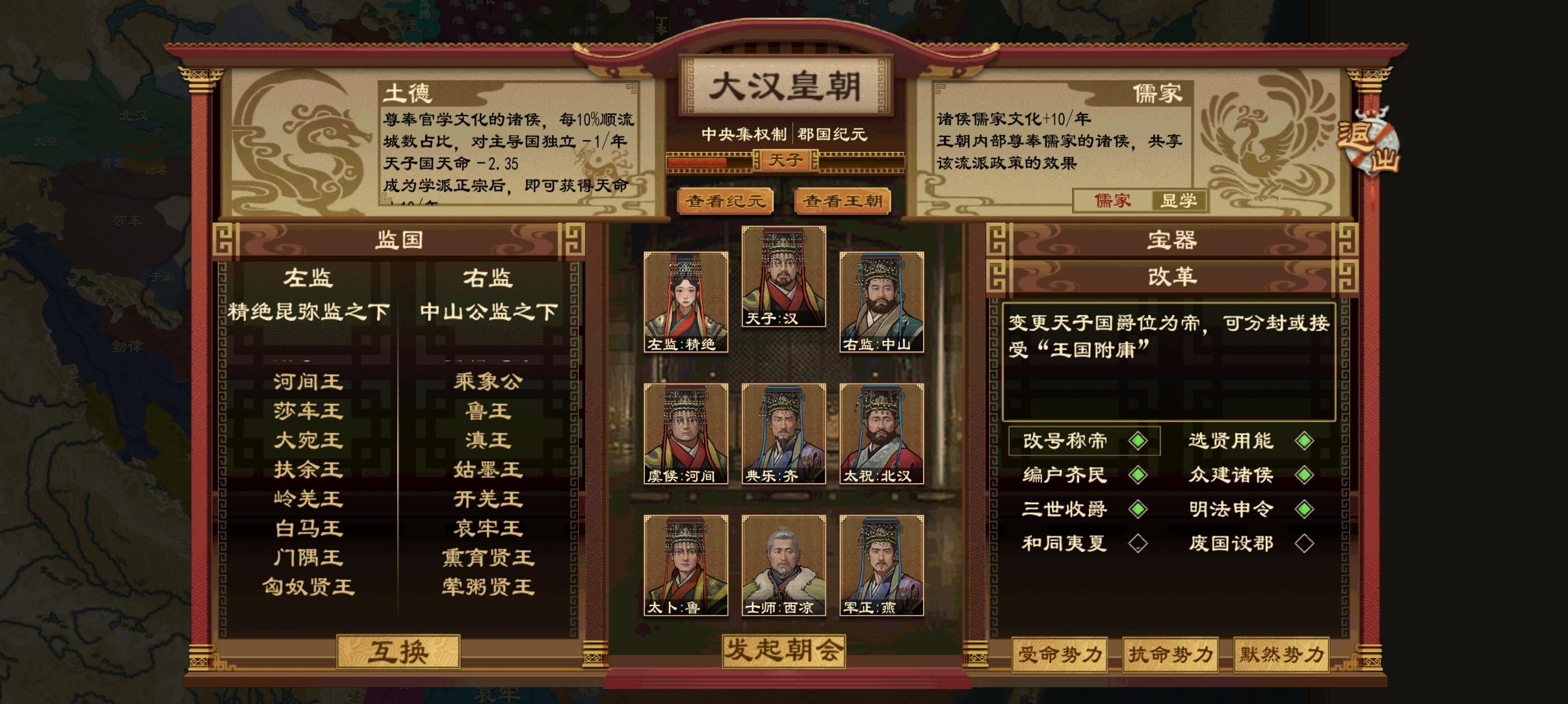 一、政策主儒+寿命+军队移速+粮食产量的政策二、国族政策优先用无中生有把文治的最后一个点出来,其它的点军队移速,随便点。三、官员优先建学校,学校加太学名额,先一年制,官员满了在三年,建学校太学生可以一年一千多个名额,够用了。四、国族升爵找个非附属国诸候相王,在建立王朝。五、国族改主流宣战,求和,文化合流。懒的写了,玩大周,有手就行。