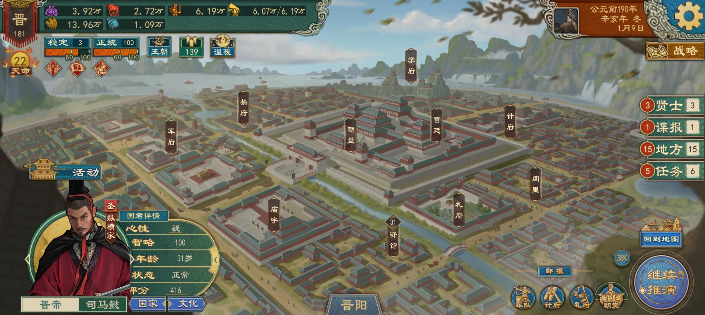 我是四个小时新手,宋国复商跟开了无畏远征一样,一千多年吃地就吃到了我的脸上,摁着周朝锤,大商野战军45万预备役50万,不过没封卿族只有六支军队,离得近的就徐国这一支,我适龄人口不多,现役军队全战力115,借道徐国直取朝歌不知道有没有机会,感觉城防军会很多啊,想找大周请援结果因为在和昆仑打不能请援