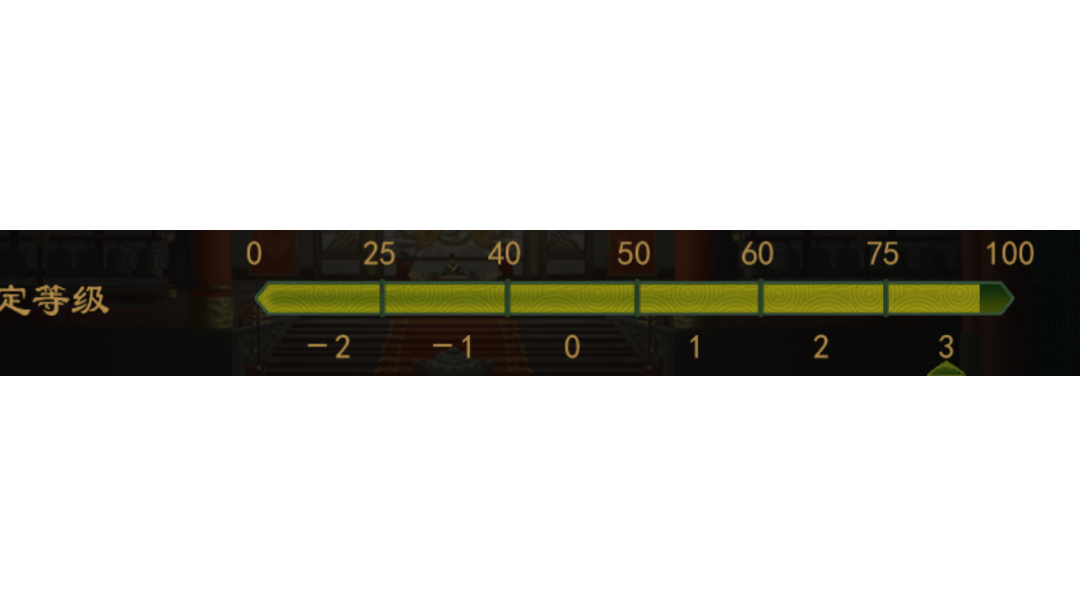 因为指标简单所以放在综合区更合适稳定:分6档0~25为-2 25~40为-1 40~50为0 50~60为1 60~75为2 75~100为3,稳定在-1及以下时,无法再施行新的政策稳定等级为3时,获得"明君盛也”:财政收入+15%、全国百姓生育+1%,全国粮食产量+15%,施政效率,还算是不错的buff,至少对新手来说还算不错影响因素:1实施政策:每正在实施一个政策-2 2朝臣能力:比如礼
