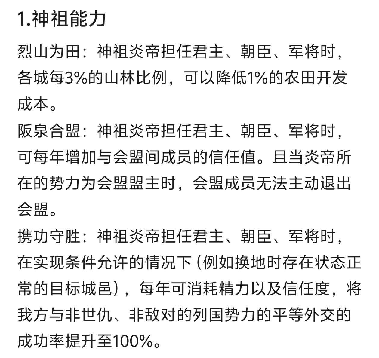 “征召部众”改回“分正二卿”,但是要优化逻辑。“分正二卿”的能力大概率是不能求学、写书与著经的,那就把能力改成buff。同时,赐予的对象由卿室家主改成朝臣或宗亲。“烈山为田”回调,但是要把强制修改地形的规定取消。“携功守胜”改成被动,固定增加外交成功率(25%~35%)“阪泉之盟”更改主动,消耗精力成为盟主组盟,选择特定国家和特定盟约。盟主外国家不可退盟,每年增加与会盟人员的信任值。(“神