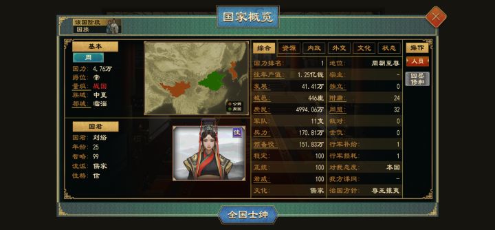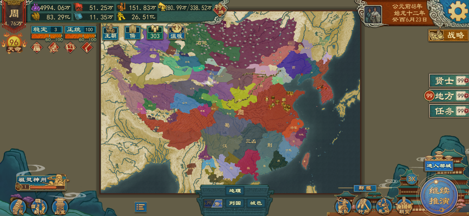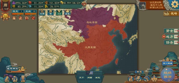 我是四个小时新手,宋国复商跟开了无畏远征一样,一千多年吃地就吃到了我的脸上,摁着周朝锤,大商野战军45万预备役50万,不过没封卿族只有六支军队,离得近的就徐国这一支,我适龄人口不多,现役军队全战力115,借道徐国直取朝歌不知道有没有机会,感觉城防军会很多啊,想找大周请援结果因为在和昆仑打不能请援