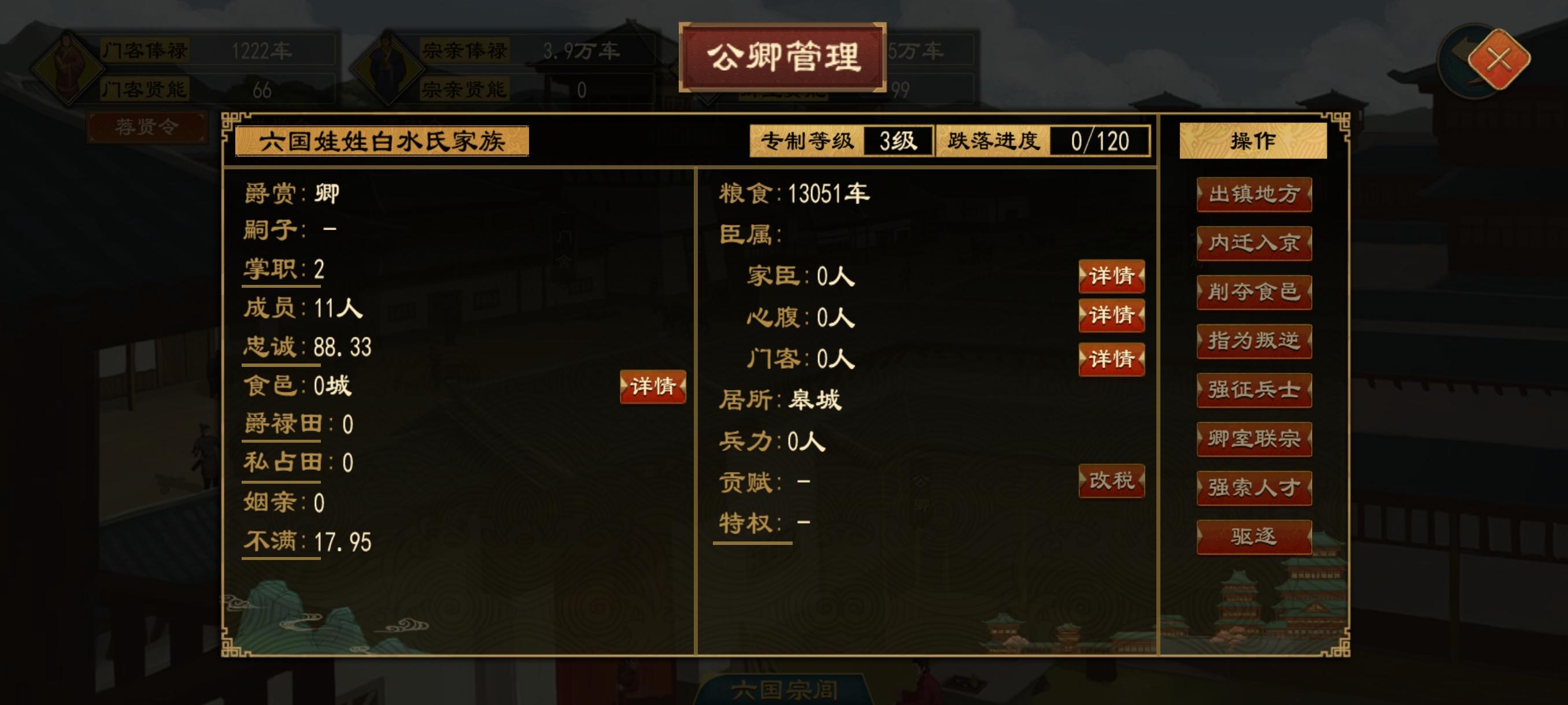 这让卿室上位还挺麻烦,不仅正统底于60以下,无宗室子弟继承(公室也不行,多了诸子之乱,少了正常继位),就算只剩下了卿室,如果有同姓但不同氏卿室,那就只呈现同姓的,图里就只呈现了子姓的乐氏、皇氏和华氏,没有嬴姓赵氏(无论有没有血缘关系,只要同姓就会显现),我还是把那几个同姓全部流放了赵氏才显现了(话说最后那张图是我君主死在遗迹后,我暂停了一会他就直接变成正卿了???)p