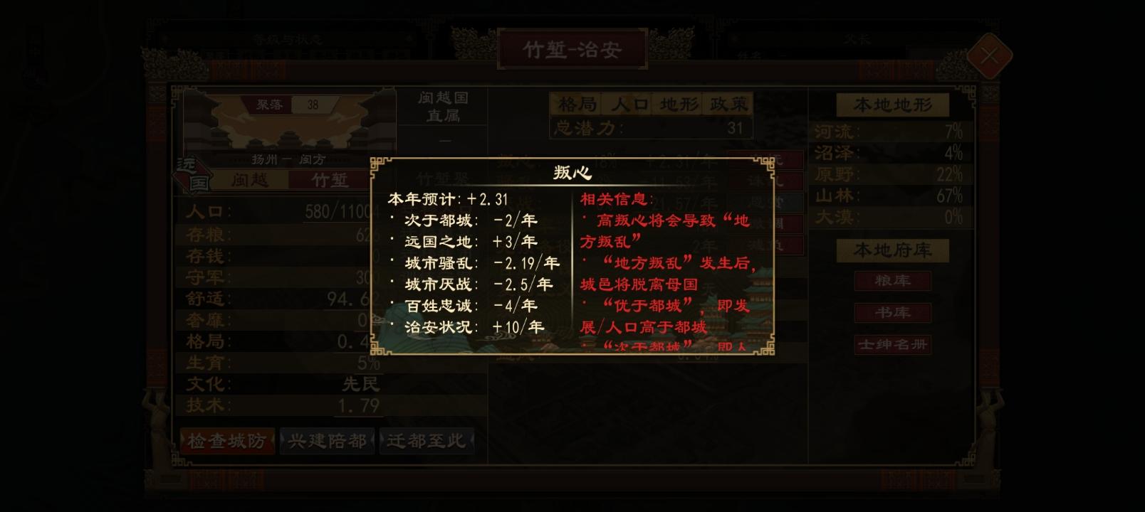 叛心每年都在逐步增加,为了防止他叛乱,我每年都要特意安抚一下,以前爆发过一次叛乱了,我是重新读档,然后安抚才发现这种情况的
