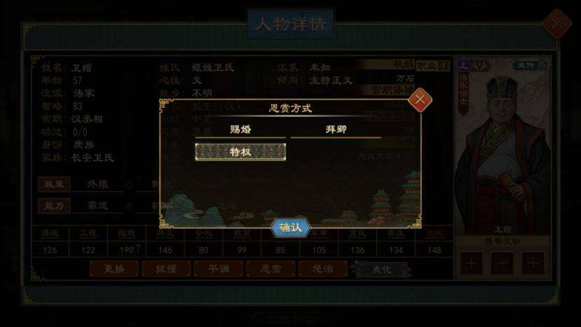 新版本新增了派系功能,当势力的阶段为国族阶段且本局游戏开启了派系开关时,官员可以组建派系。 1.派系诞生1.1派系成立新版本派系分为“忠君派”“政见派”“谋身派” 三种。满足条件的朝臣可以组建派系。朝臣组建忠君派的条件为:1、拥有了入朝不趋、赞拜不名、剑履上殿其中一个特权2、执政经验(功过之和)大于50朝臣组建政见派的条件为:1、官职为三公九卿2、方针与当前国家方针为对抗关系3
