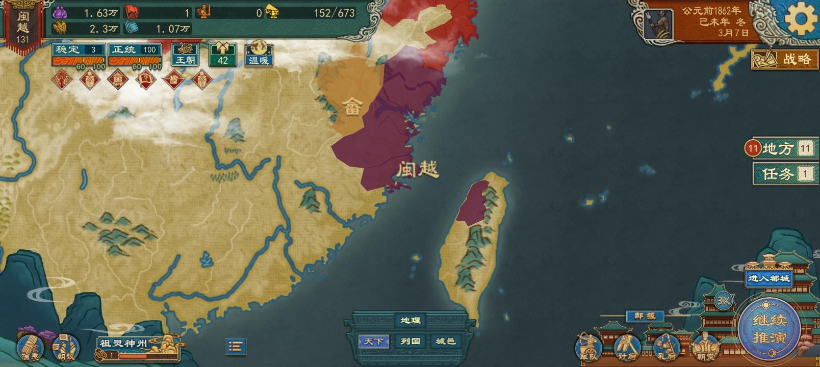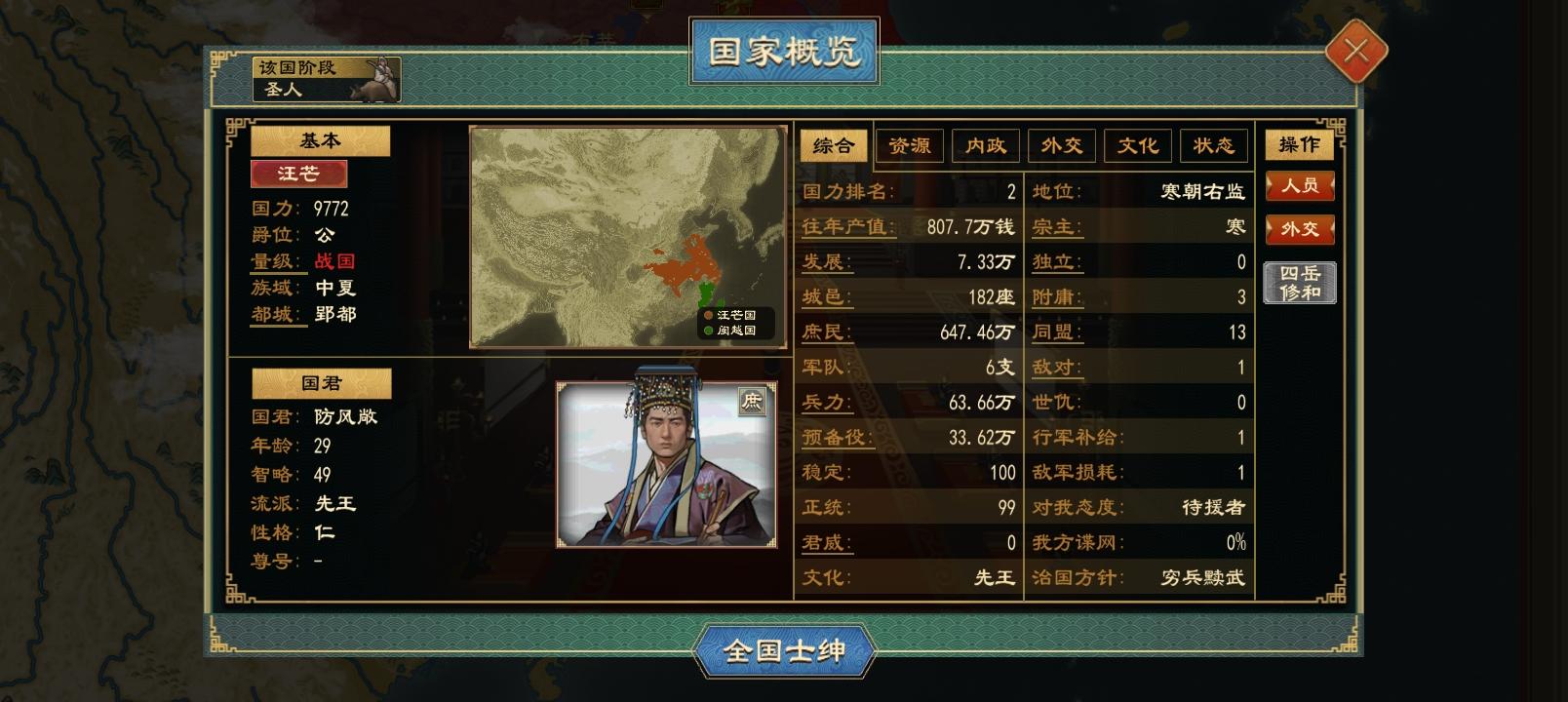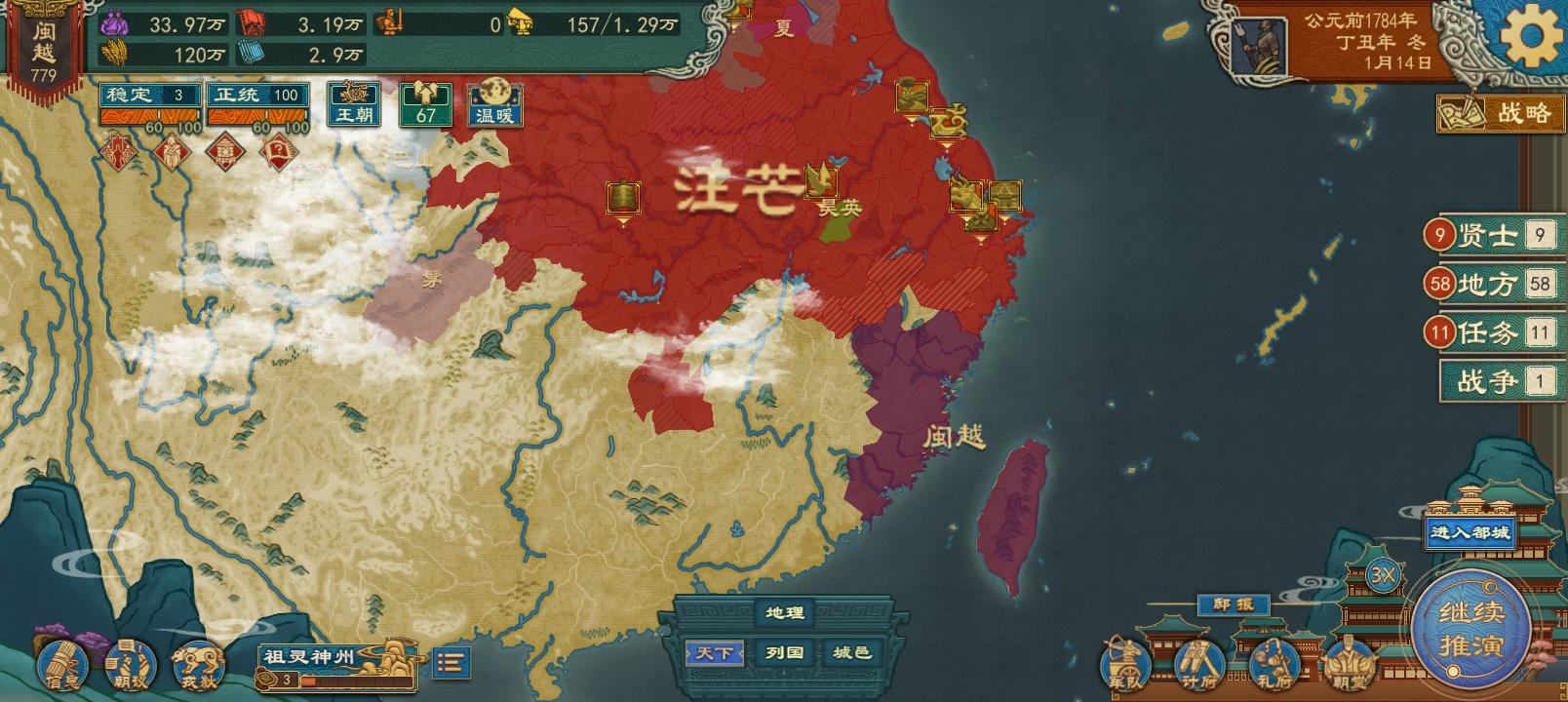 对手已经是圣人阶段了,我还是个野人最厉害的军队就是弓兵,对面有最厉害的车兵还有数10万的大军,我目前已经准备开新档了,主要就是想模拟秦国小国逆袭,其实更爽的还是种田和治国的感觉已经没有遗憾了,属于是,再过两天大更新不就来了嘛,我打算去西汉新朝那里试一下军阀玩法