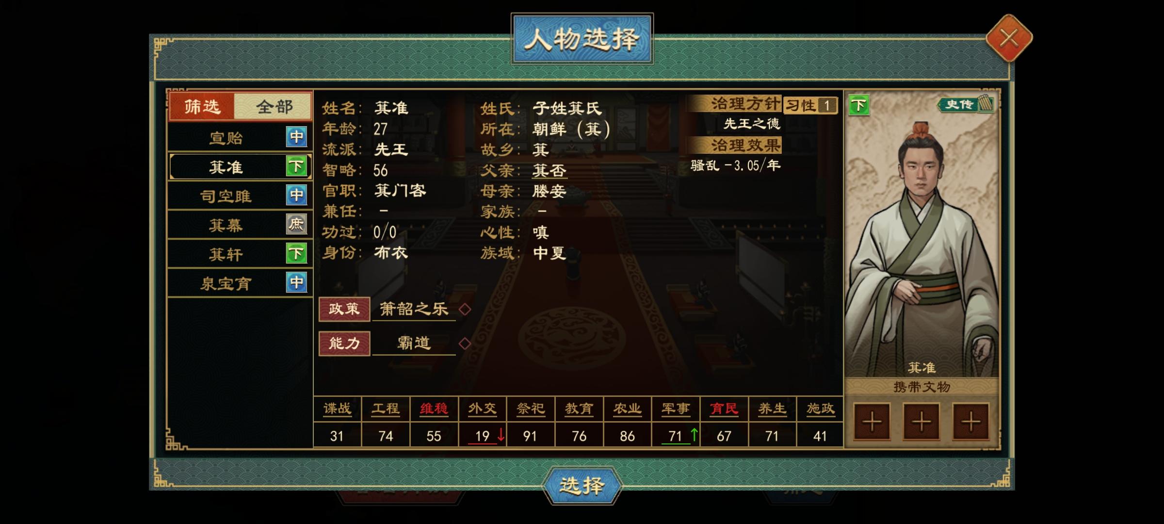 1.开始游戏2.选择剧本年代-上古等3.选择角落国家(非四面都有国家,打架起来,不能发育)4.发育篇:4.1 直接去驿站找游女,多找几个结婚,后面可以给兄弟封地(旁观者模式没用,AI自毁流放),【分封封地作用:分割战场,避免1打多,避免自己领土与多个国家接壤导致冲突打架,前期最重要的是发育。】4.2 招贤臣,集贤-招募令这里10连抽梭哈,有2-3个紫色就行了,前期顶用,后期发育起来绿色的