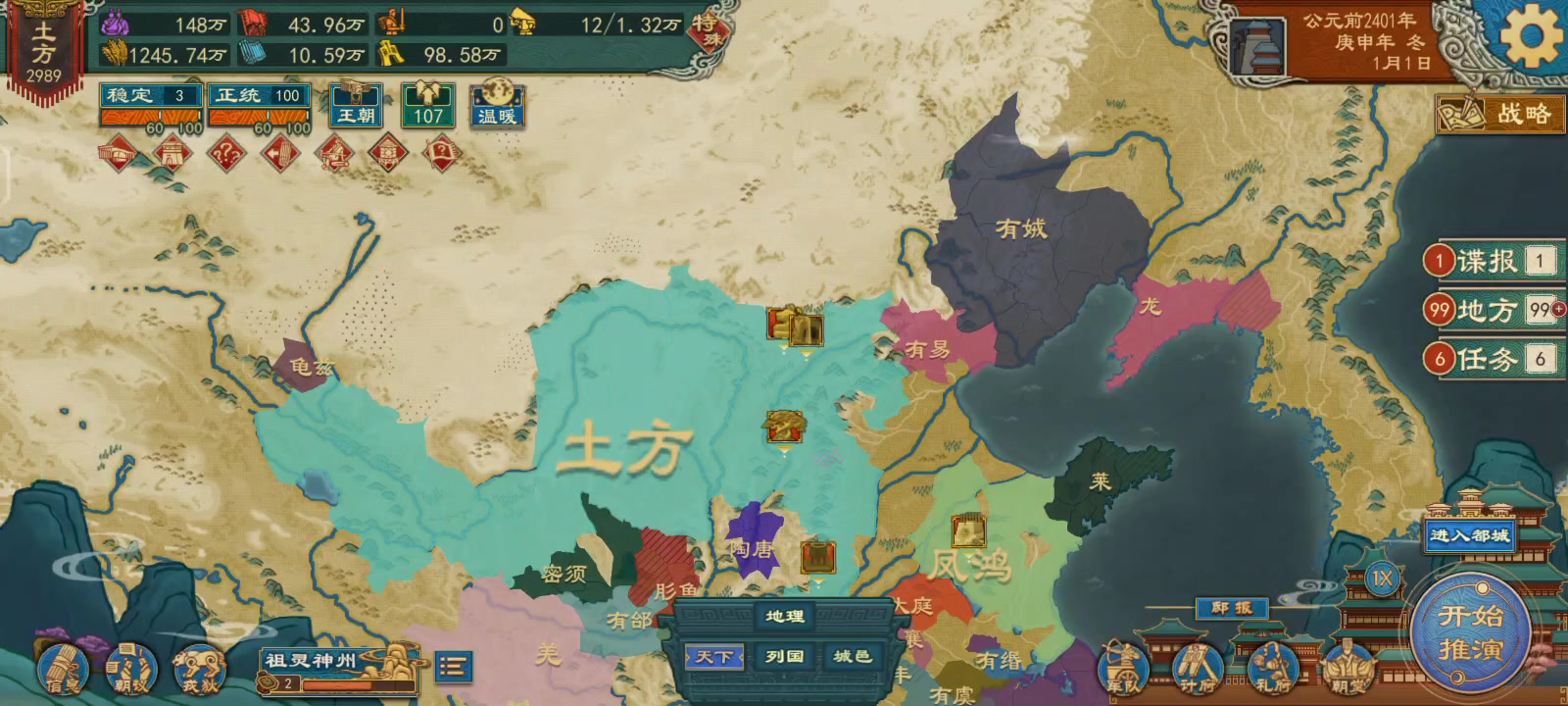 楚汉争霸剧本,开局抓个扶余怨种刷叛军,刷个中夏先民,然后直接自诛九族掉正统换国君,这局我最终目的是点完先民至圣人所有技术和政策,疯狂叠buff成“最终形态”的“巨无霸”。我这局到圣人阶段之前,都保持中夏族域 众所周知,西戎礼法文化只能点游牧、绿洲、先王三种文化,剩下四夷也是同理,只有中夏才能点完所有礼法政策,这应该是策划对中夏的加强吧,这游戏现版本前期中夏还是挺强的,专属“讨伐戎狄