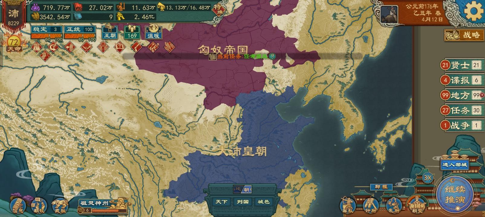公元前120年,大秦决定挥师北上由两位神将带领卫青 百战百胜的新秀将领陶淹 是从上上代皇帝时期一路征战下来的经历300多场战斗,当之无愧的大秦第一神将,可惜后继无人战端一开我们就向匈奴后方的俩大部落发起策反,匈奴人可能是很久没有征战了只能组建5万大军,就算实力超群,我们也能直接策反4万大军但匈奴人战力堪忧屡战屡败,还未坚持到策反成功便直接崩溃了,当初清理齐燕几个藩王都用了10年,损失300