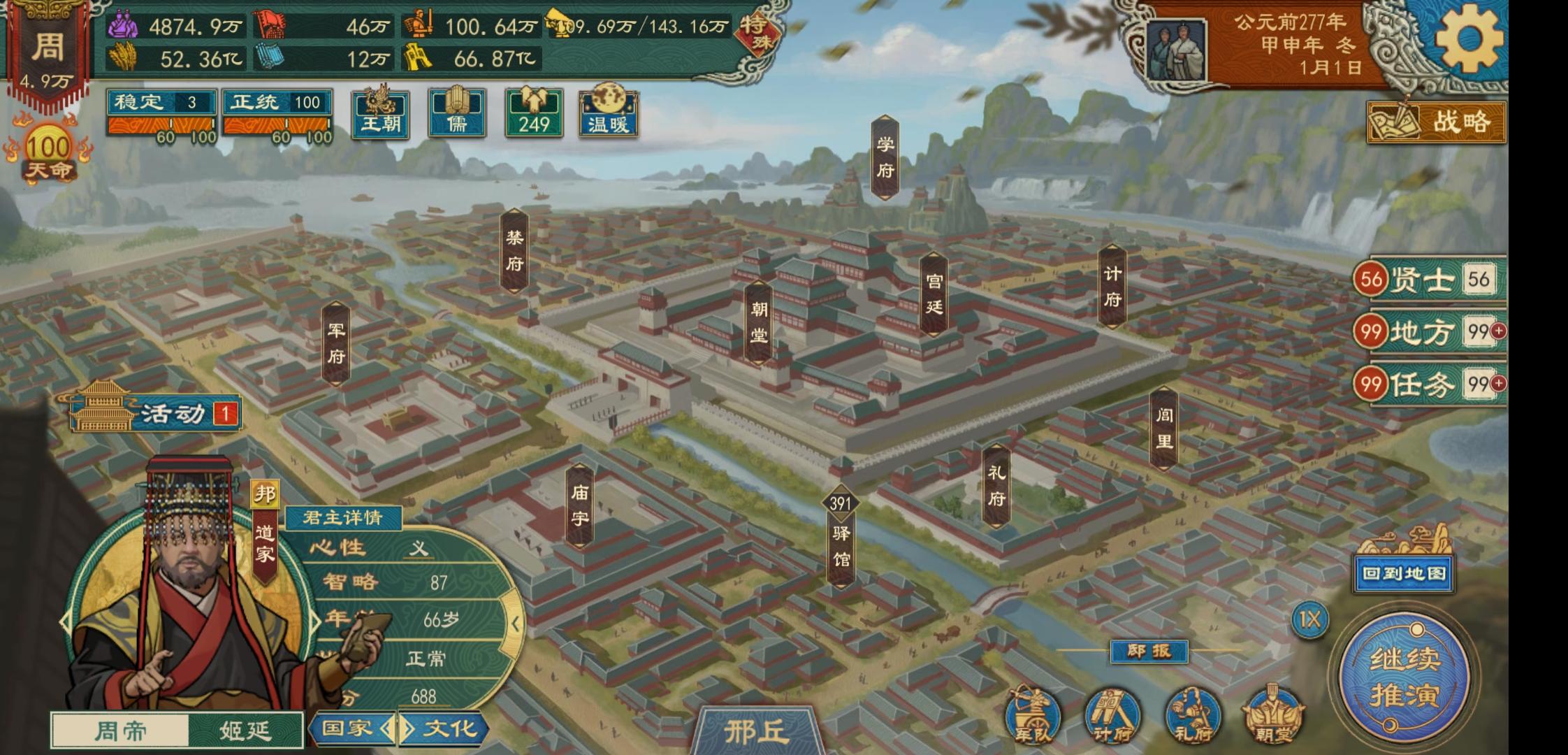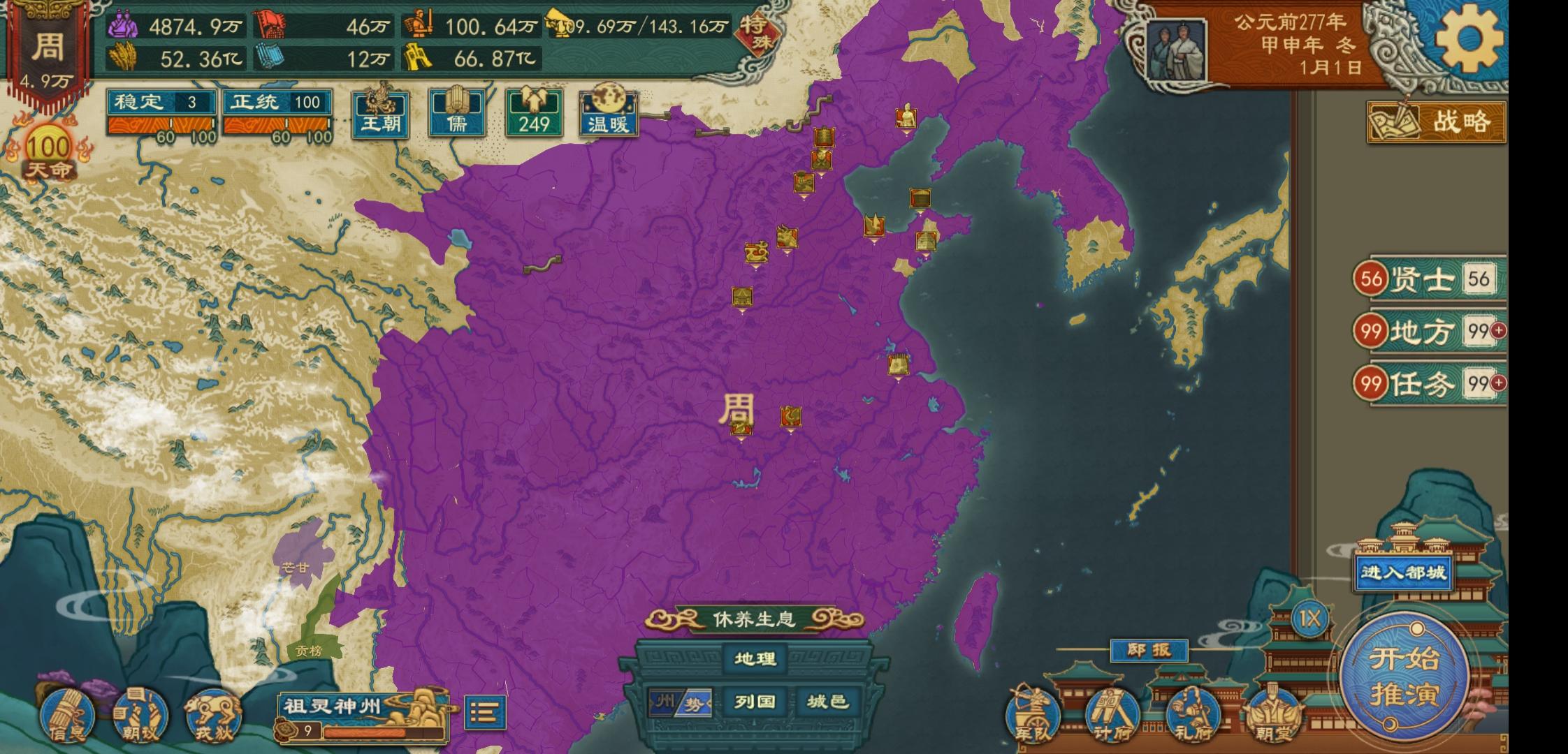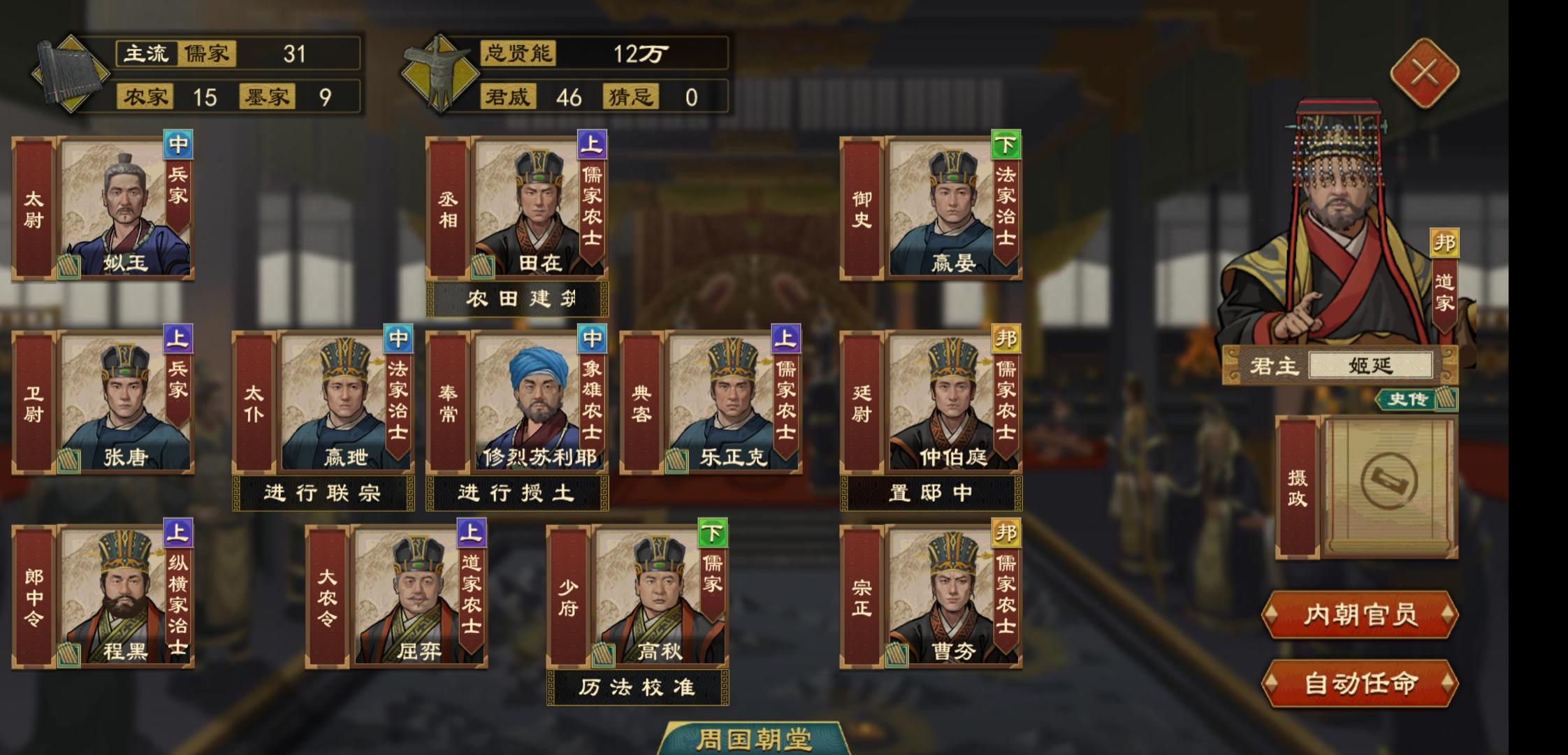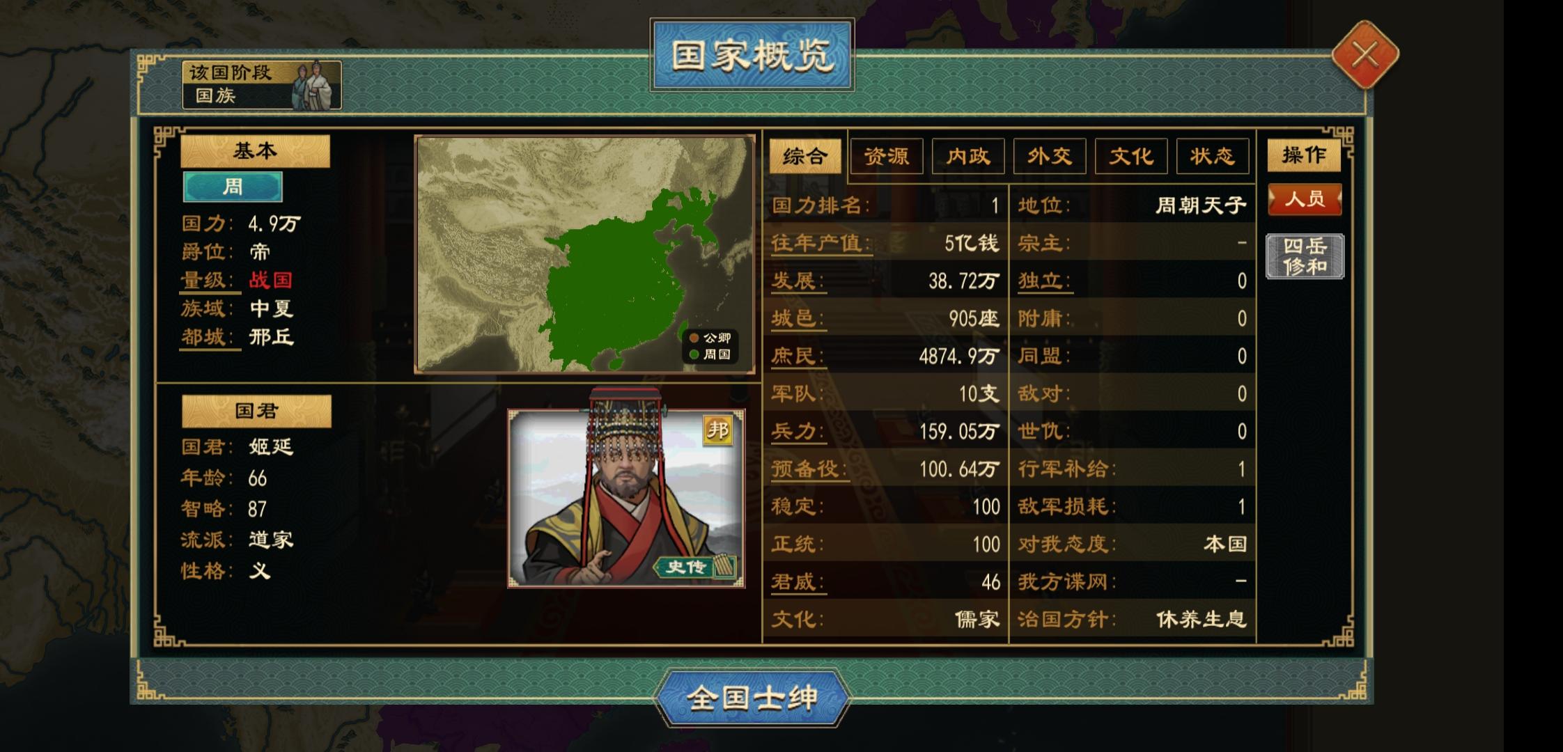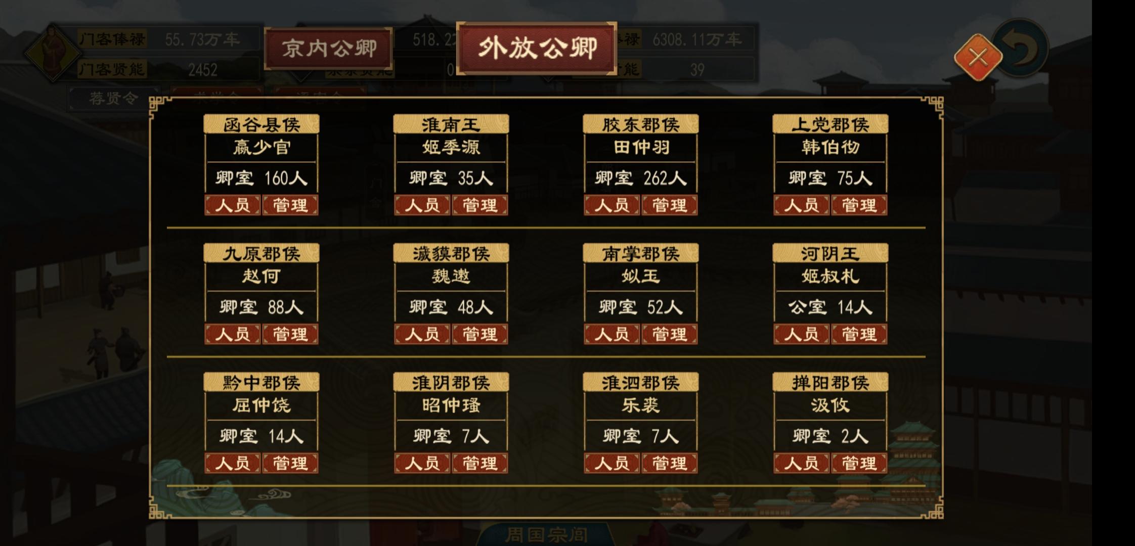 很诡异啊老铁,真的纯属负优化功能了,国庆国族版本优化的庶室家族不说一点用没有吧,提高爵位只能免税不说吧,对其操作依然丝毫用没有,要么可以强制解散 要么可以纳入京内成为第三类卿族来说怎么个诡异法吧,因为之前一直玩的秦汉的图,从霍光之后可以说史传邦士没有了,一直到刘秀,所以我没怎么在意门馆刷新的邦士以及那些史传人物,都是求学读书讲学自己养或者等饿人剧情,直到昨天突发奇想重新开了个春秋五霸剧本 这就是