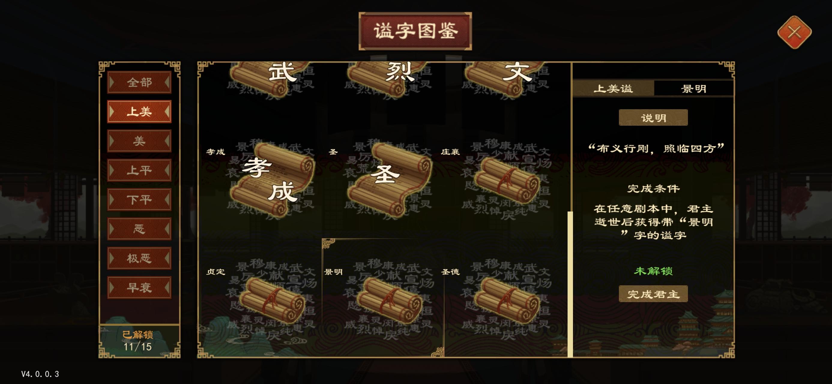 根据论坛大佬列出的获取双字谥号的条件中,有一条为前后30年的评分等级需不同。但这导致了双字上美谥中的“景明”无法获取,因为“景”和“明”两个谥号都为美谥。相同的情况“庄襄”也存在,但历史上有秦庄襄王,因此这个谥号可以在田单复国剧本中找到此人来获取。但“景明”这个谥号历史上能查到的使用的只有前秦皇帝符健。目前大周尚未做到十六国时期,目前不可能通过在3年内使国君去世的方式获取该谥号。所以,我想问,这个