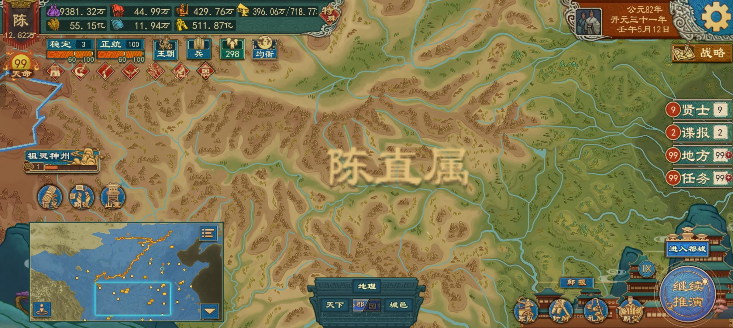 众所周知,去年7月推出来的国族阶段,到现在已经三次大更新了。现行国族阶段已经有满足货币俸饷的条件了,就是必须要点辩者的边贸维和和均输平准,再加上本次更新出的工商集聚和都邑市坊的buff。首先编制州郡,找到桑树和盐矿资源,按照储存量生产丝绸和食盐,然后在这些城的边境分封藩王,出镇藩王,税率可以拉到厘金关赋这个20%的率,就能做到货币俸饷改革的条件了。北方丝绸并不多,桑丘、顿丘、城濮、聂北、太康、商
