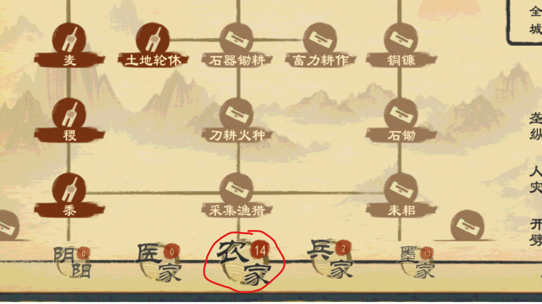 一些新的能力,兵家的军粮转运和农家的干储军粮能增加行军补给可以抵消国族阶段军事引申政策增加的边境和关塞损耗,墨家的坚壁清野和隘口民兵加大量行军损耗这些显得国族阶段更加没用了