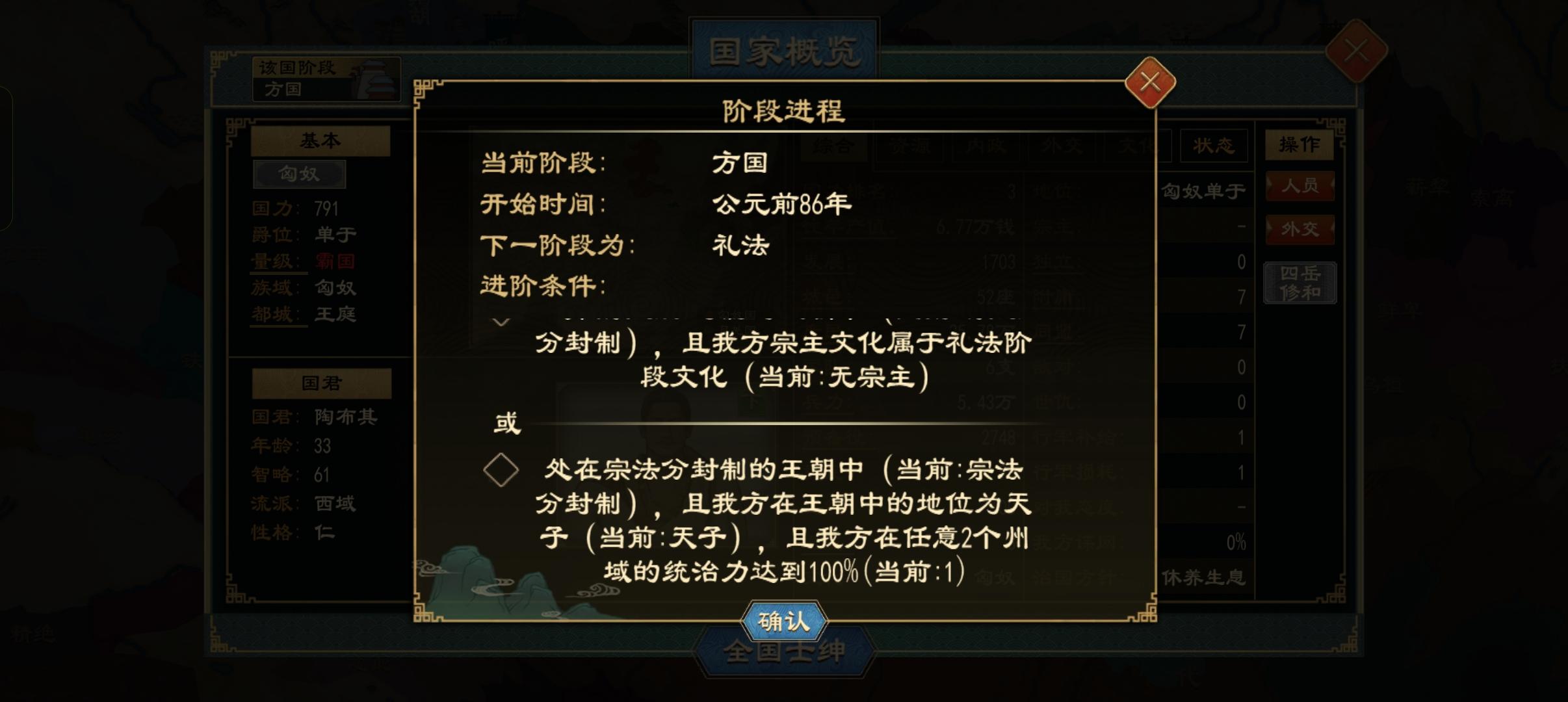 玩的西汉剧本方国,想升礼法,因为没礼法王朝就帮匈奴统一北漠和徐州升礼法,徐州没问题,我看是100的,北漠我看不到,就从地图上看已开垦城市119个,从信息里数城市也是119,国家数也是对的,但匈奴进礼法要求还是显示1个州不是两个,是bug还是北漠不能用来进礼法条件?另外我看匈奴北漠威望只加了4.2每年,是因为有一个匈奴公室原因吗,没能100%也是因为他吗?