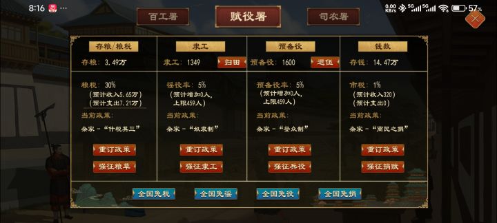 如图,炎帝第一个能力是烈山为田,这个不用多说,减少开垦农田的成本。评价NPC。然后剩下两个分别是强制会盟和花费100精力强制平等外交百分之百成功(一年只能使用一次)。首先先说这个平等外交,非同盟情况下平等外交相对有用的是联姻,借道通学,换地这三个。是同盟的情况下,比较有用的是威压。交战情况下比较有用的平等外交是迫和,但是因为需要50信任度,所以在交战的情况下不能使用。所以这个能力我评价是拉完了
