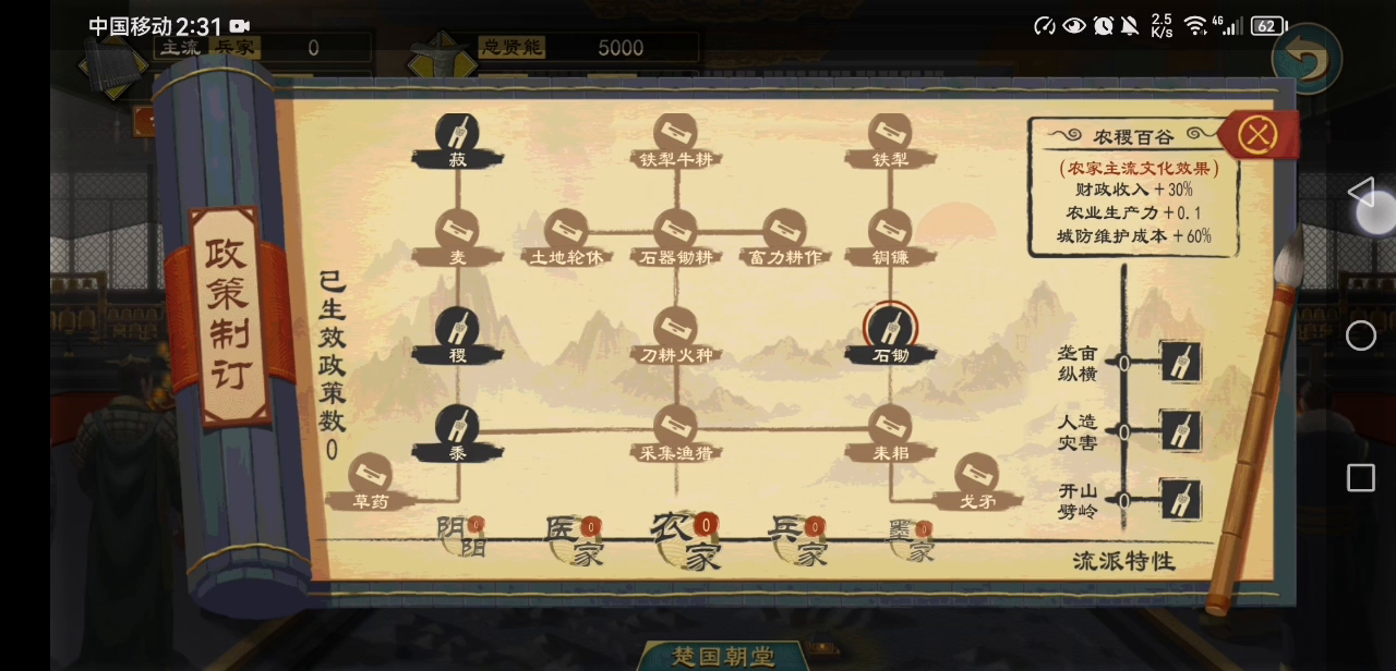 开局先稳定后方,顺便积蓄力量,实行3个十年和平发展计划,与齐,卫,晋结好关系,努力发展农业,多招募门客,期间可以打小国,小国尽量不是同盟国的附庸,等力量积蓄足了,就可以开启争霸之路了。 打一个国家时可以兵分多路,利用地形路线,适当分配兵力,分散敌国用兵,意在牵制敌方,给一路部队创造逼近敌国首都的机会,从而一击必胜。 政策看系统给不给机会点,有机会就点,其实用不用也无所谓,看个人吧,我一个政策也没点